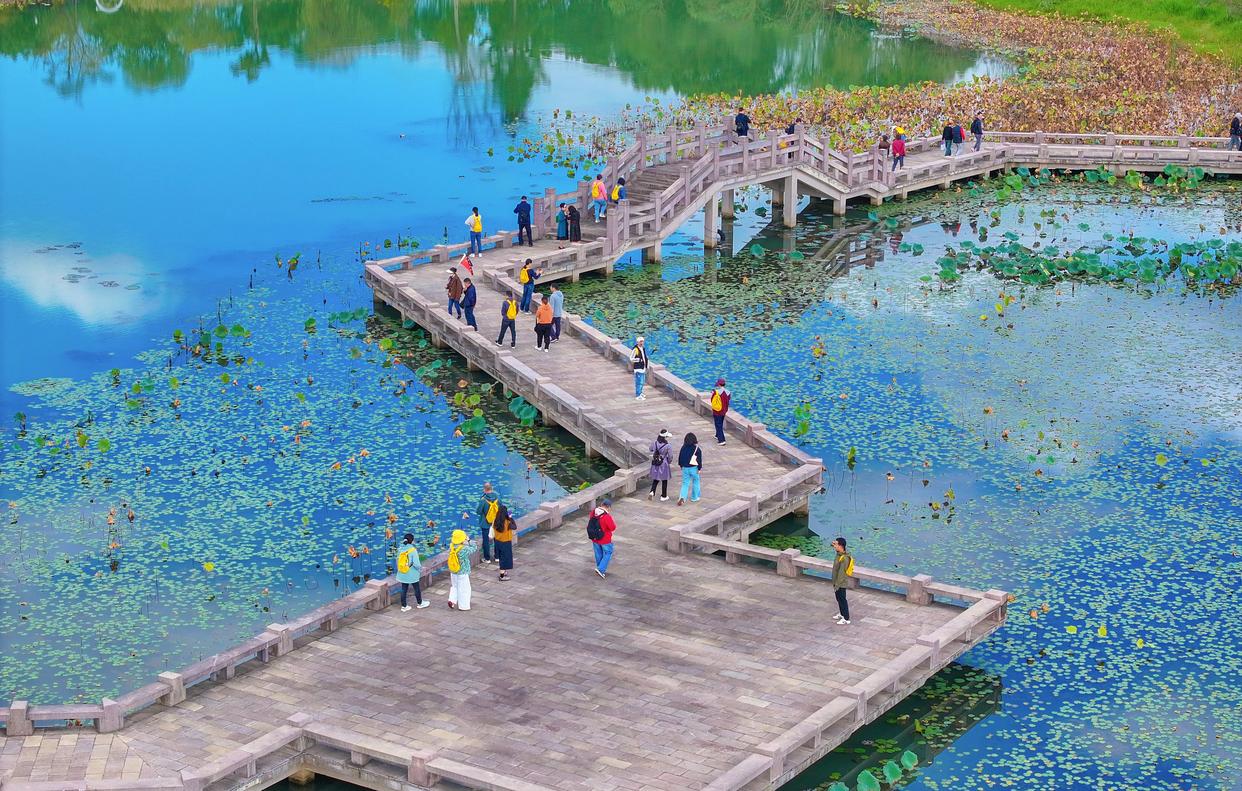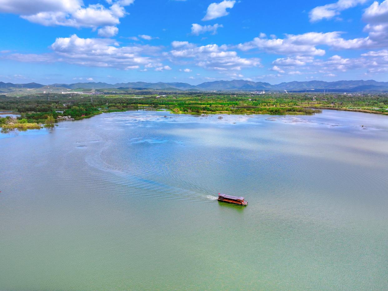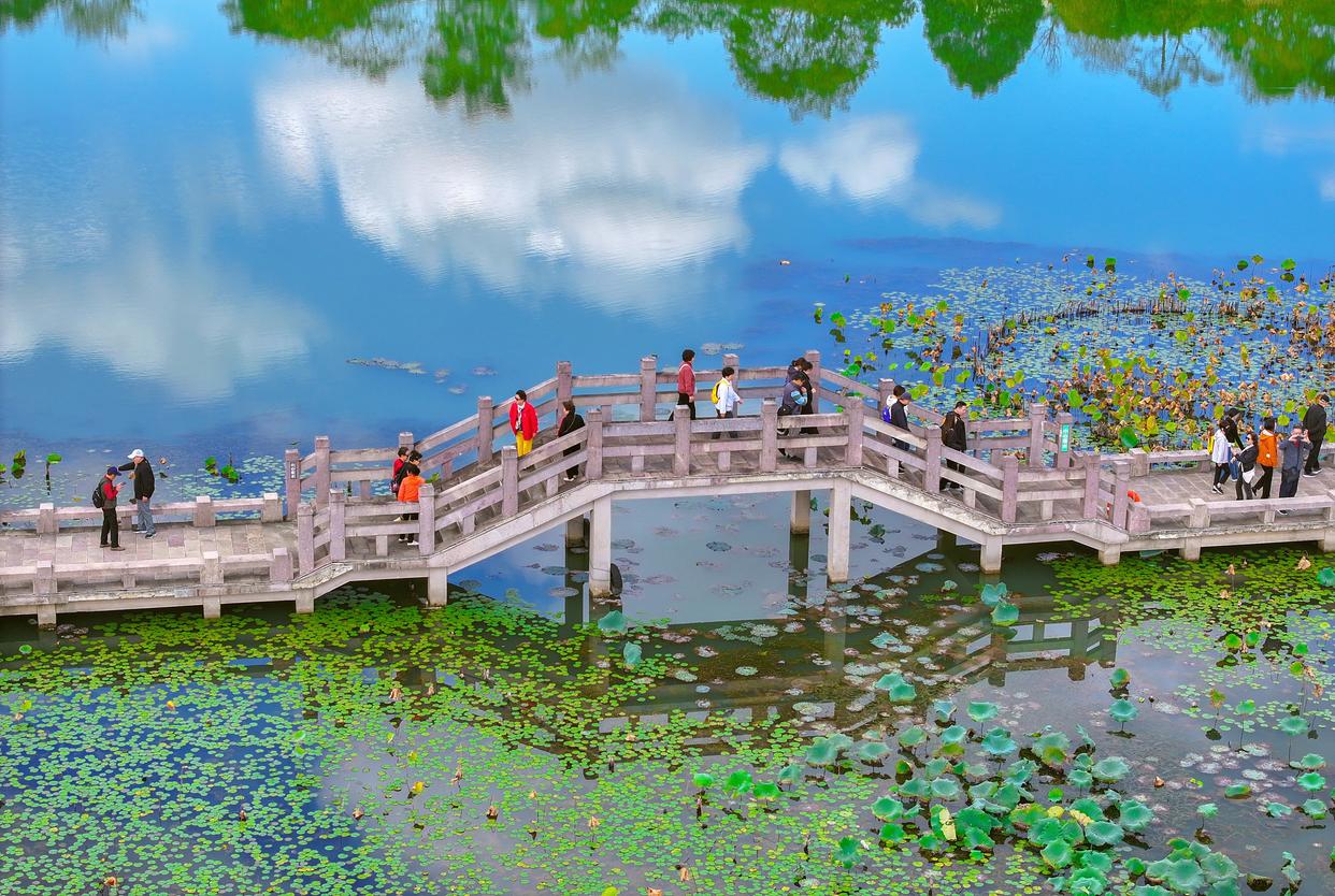 浙江省湖州市长兴县泗安镇仙山湖国家湿地公园风景宜人,游船行驶在湖面上,与蓝天、白云、小桥、游人相映成景,景美如画。