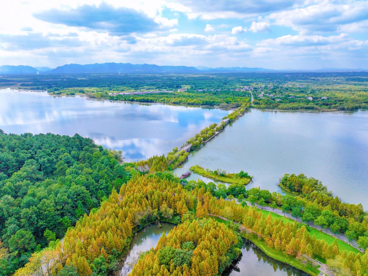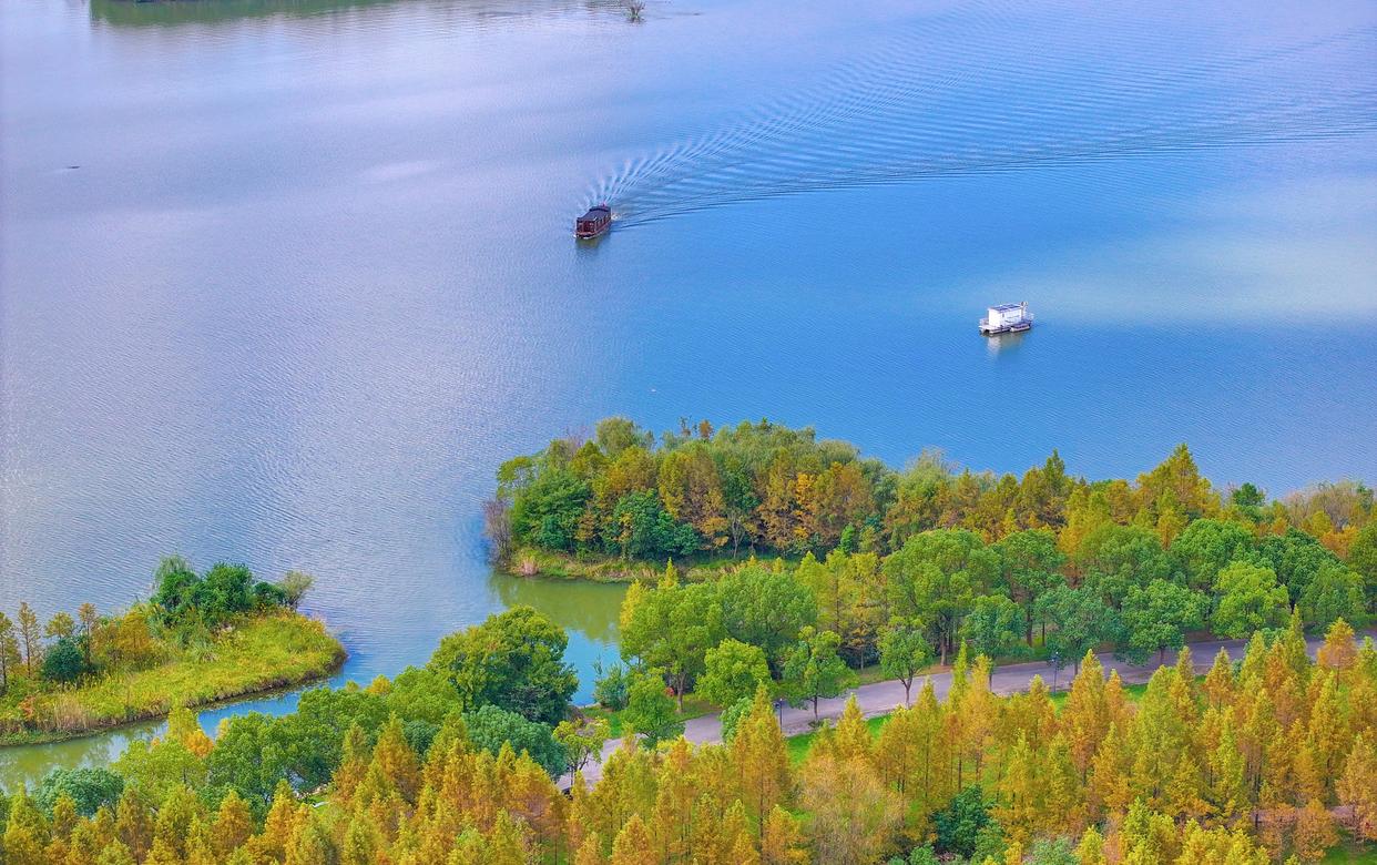 以上图片:2025年10月23日在浙江省湖州市长兴县泗安镇仙山湖国家湿地公园拍摄的风景。(无人机照片)CICPHOTO/陈海伟 摄
