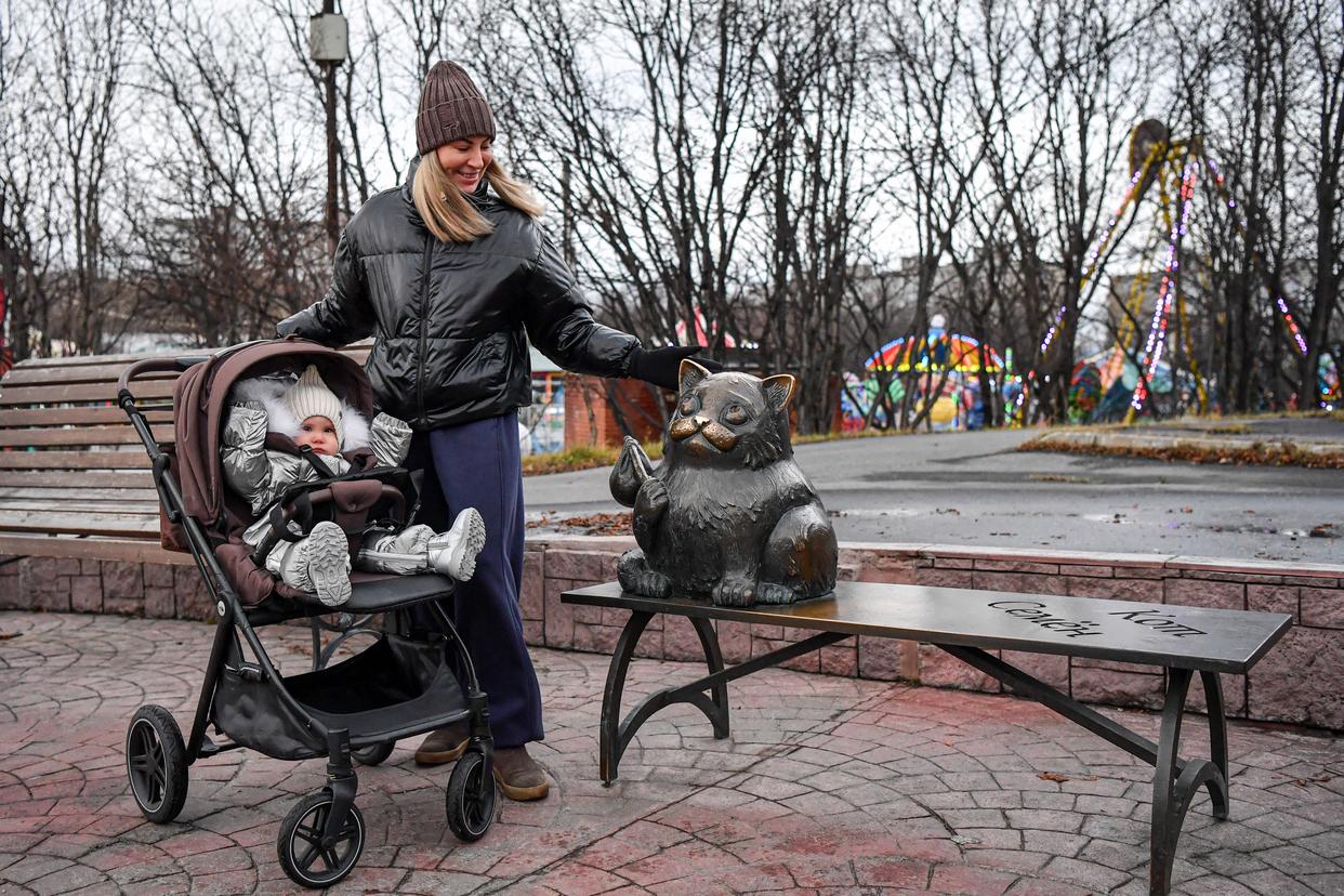 10月23日,在俄罗斯摩尔曼斯克市,一位母亲带孩子观看“谢苗”猫纪念铜像。这个铜像的原型是一只名叫“谢苗”的暹罗猫,它在摩尔曼斯克堪称传奇。1987年,“谢苗”猫的主人一家在莫斯科度假期间不慎将它丢失。6年后,这只猫凭借一己之力,跋涉2000多公里,从莫斯科回到了北极地区的家。当地人为纪念这只猫,在湖边为它塑像。散步的人们总爱在这里坐一坐,摸一摸这只可爱的“猫坚强”。新华社记者 张超群 摄
