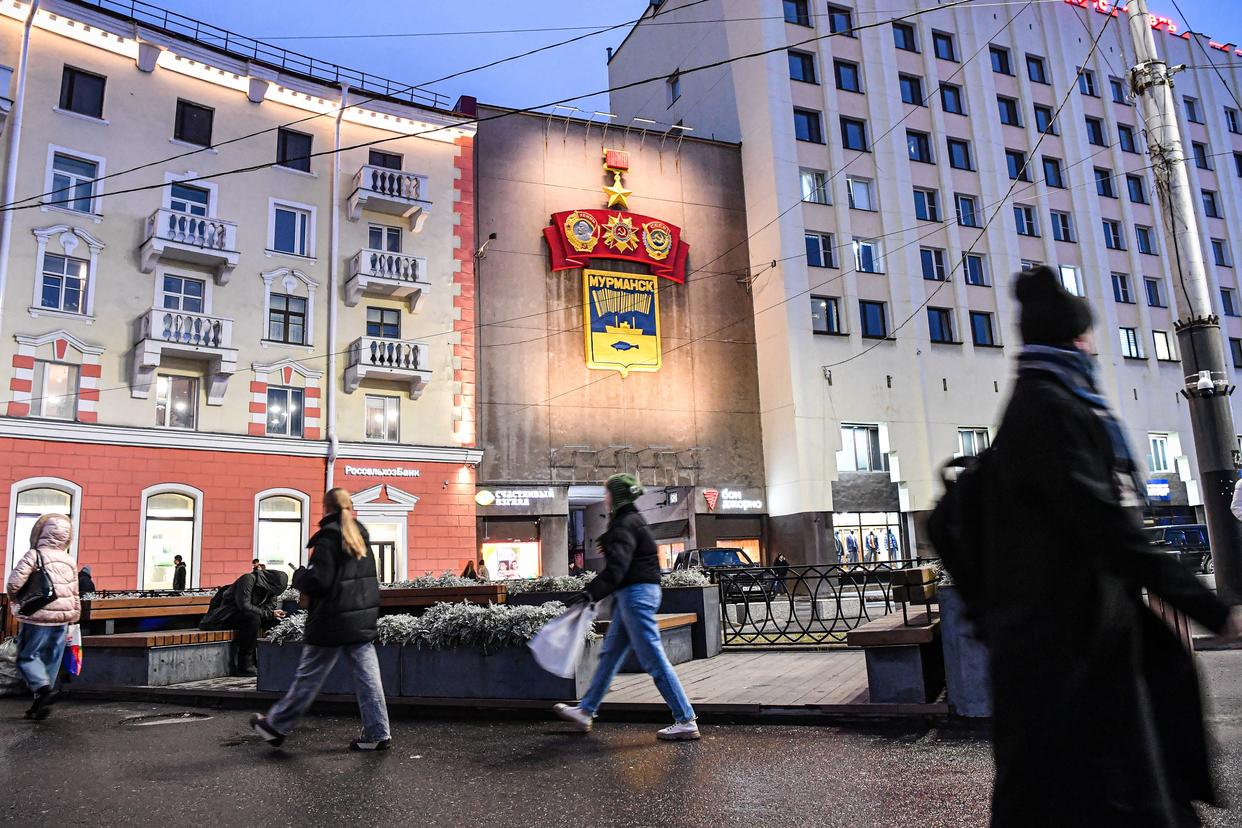 这是10月24日在俄罗斯摩尔曼斯克市拍摄的街景。图中建筑上装饰有摩尔曼斯克市市徽、“英雄城市”等标志性图案。新华社记者 张超群 摄