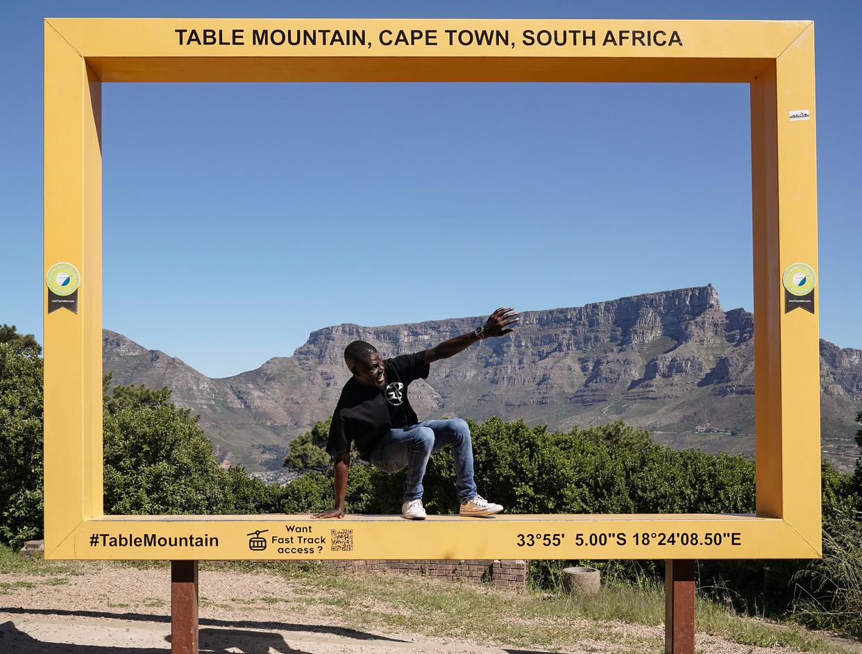 10月20日,一名男子在南非开普敦与桌山合影。新华社记者 韩旭 摄