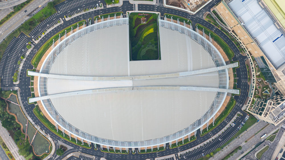 ↑位于广州的广东省奥体中心游泳跳水馆(10月17日摄,无人机照片)。全运会跳水、水球比赛在这里举行。新华社记者 毛思倩 摄