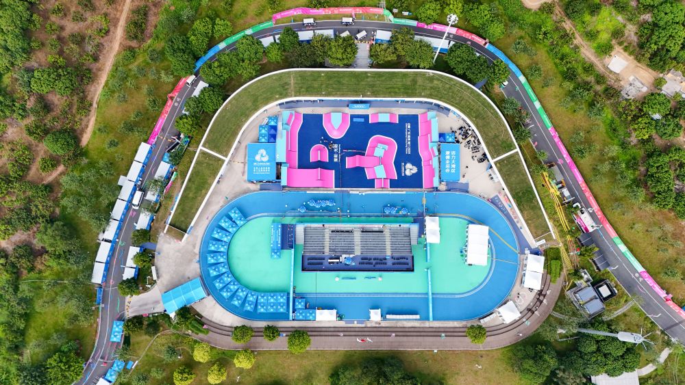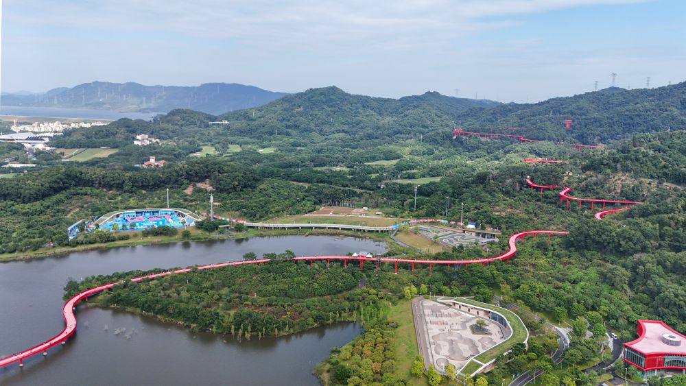↑深圳市光明区虹桥公园(10月25日摄,无人机照片)。全运会自由式小轮车比赛在这里举行。新华社记者 梁旭 摄