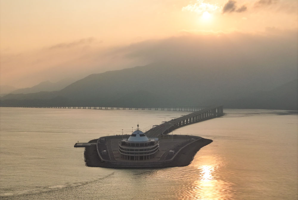 ↑晨曦中的港珠澳大桥和蓝海豚岛(10月19日摄,无人机照片)。港珠澳大桥是全运会公路自行车项目途经地,一桥串联粤港澳三地。新华社记者 毛思倩 摄