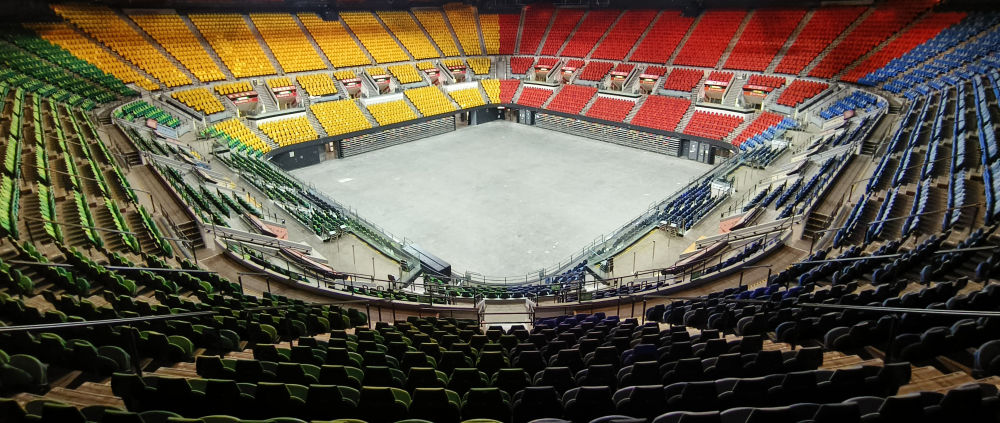 ↑香港红磡体育馆内景(2024年12月6日摄)。全运会篮球男子22岁以下组比赛在这里举行。新华社发(香港康文署供图供图)