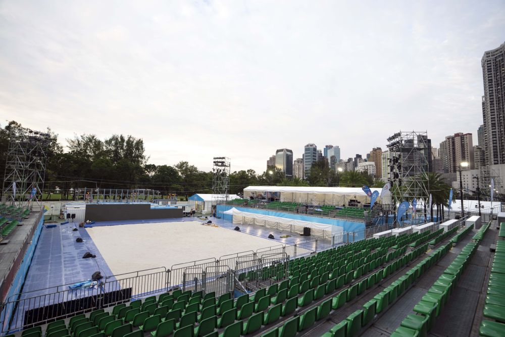↑香港维多利亚公园沙滩排球场地(10月25日摄)。全运会沙滩排球比赛在这里举行。新华社发(吕小炜摄)
