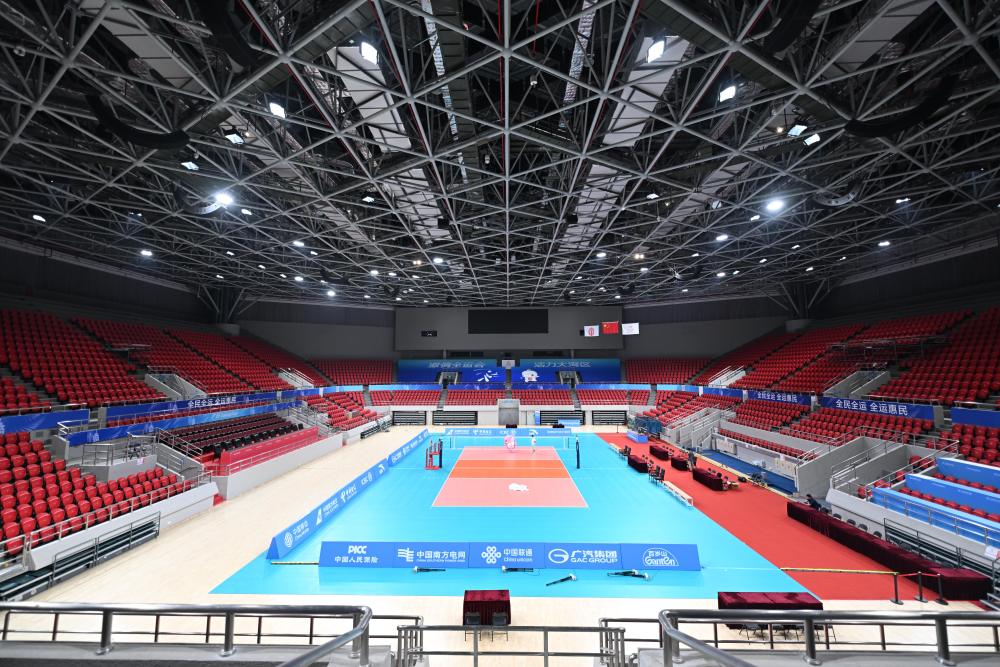 ↑广州天河体育中心体育馆(10月18日摄)。全运会排球男子18岁以下组比赛在这里举行。新华社记者 邓华 摄