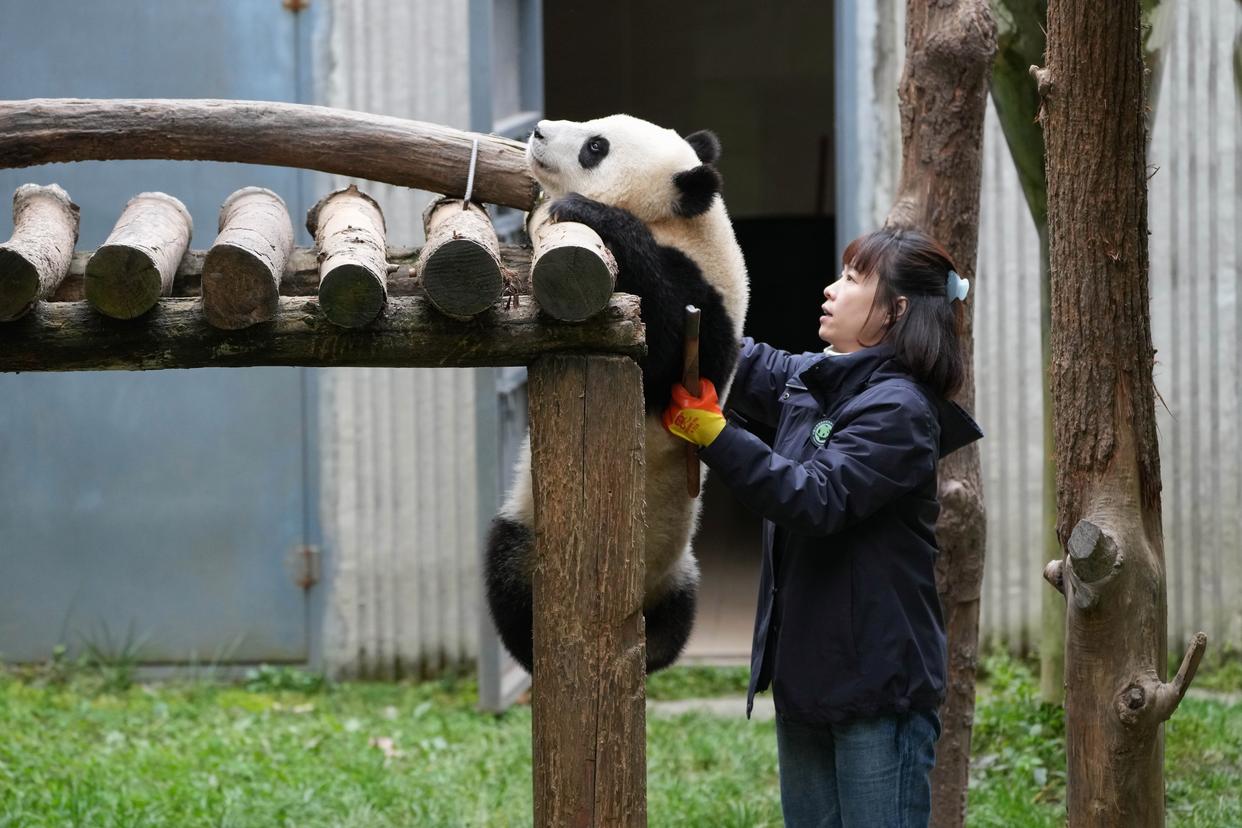 11月6日,在中国大熊猫保护研究中心神树坪基地,饲养员辅助大熊猫练习攀爬。新华社记者 胥冰洁 摄