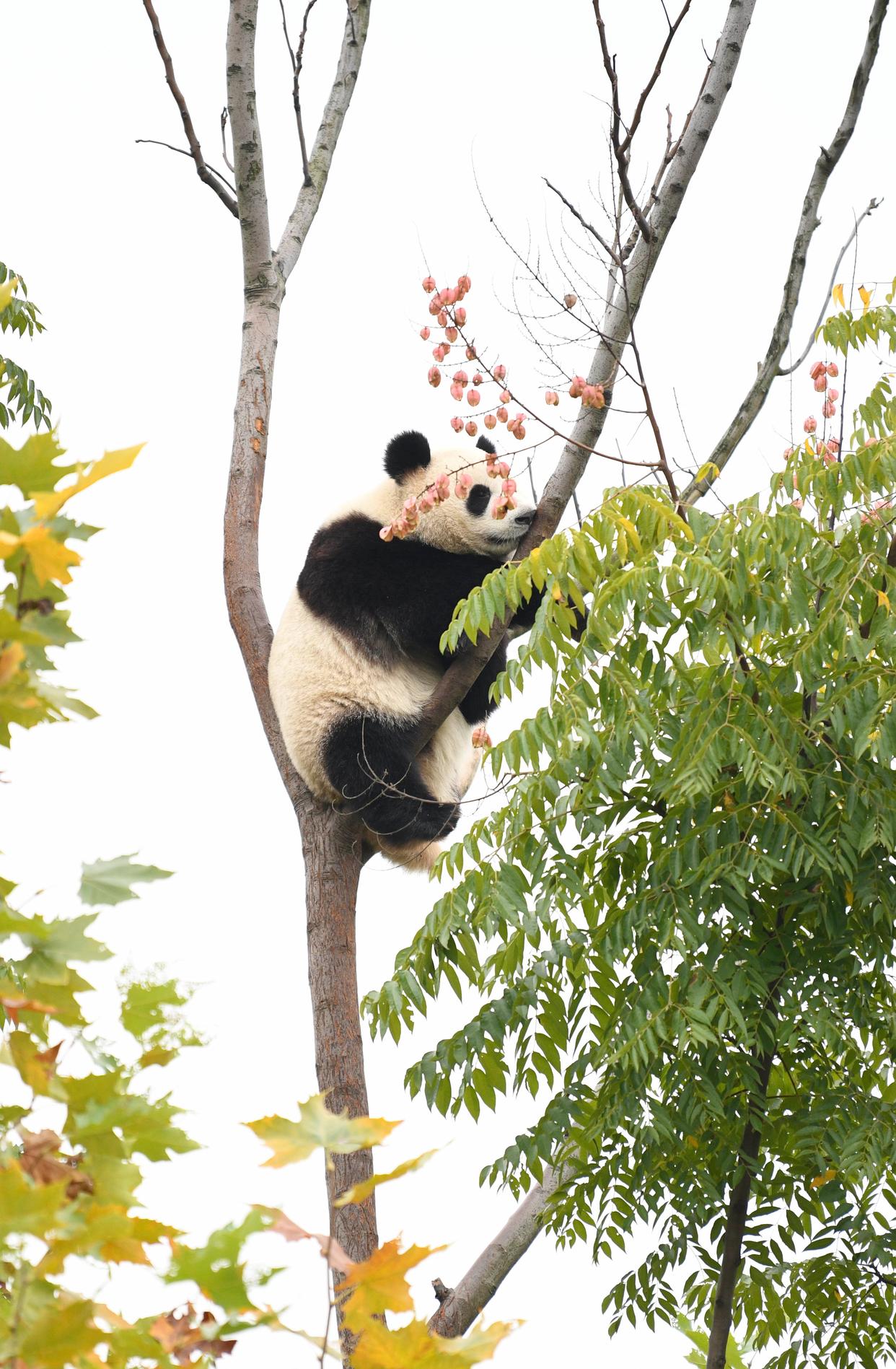 10月30日,在成都大熊猫繁育研究基地,一只大熊猫在树上玩耍。新华社记者 鲍菲菲 摄