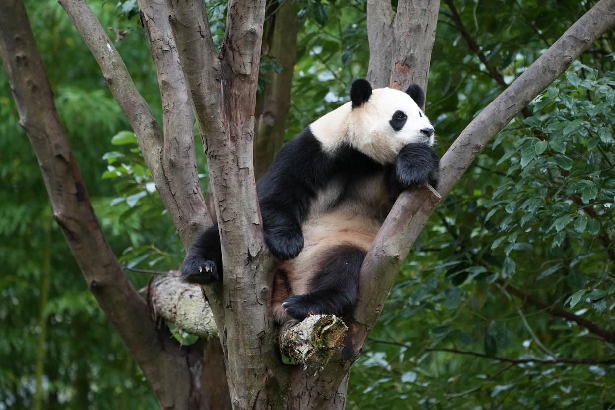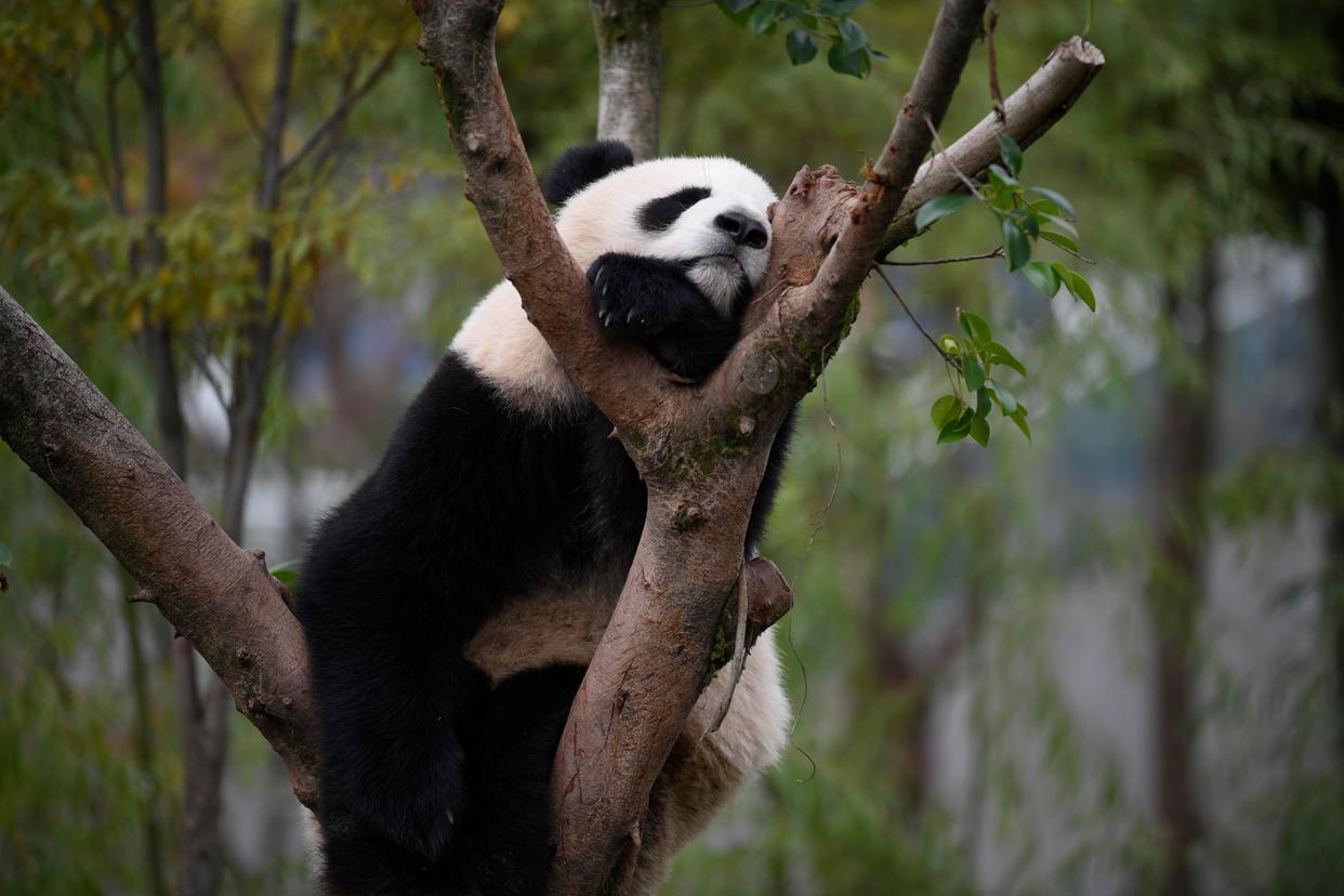 11月6日,在中国大熊猫保护研究中心神树坪基地,大熊猫“福宝”在树上休息。新华社记者 胥冰洁 摄