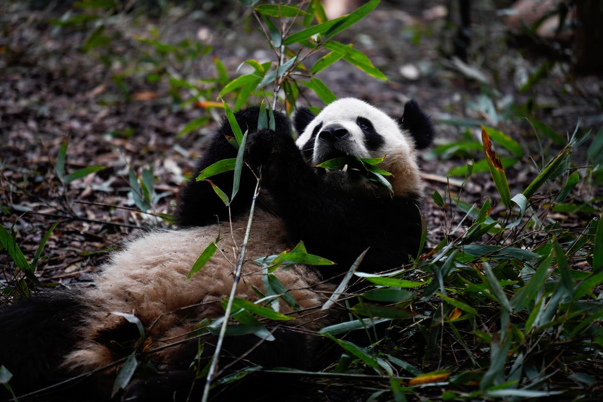 11月6日,在中国大熊猫保护研究中心神树坪基地,大熊猫“灿阳”在吃竹子。新华社记者 胥冰洁 摄
