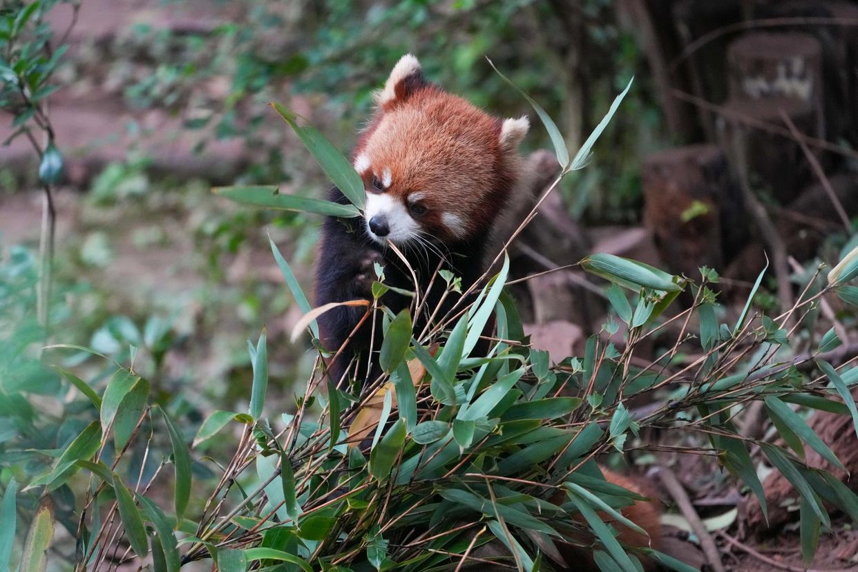 10月30日,在成都大熊猫繁育研究基地,一只小熊猫在吃竹叶。新华社记者 胥冰洁 摄