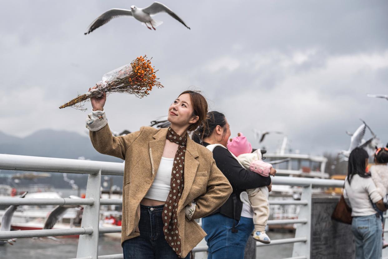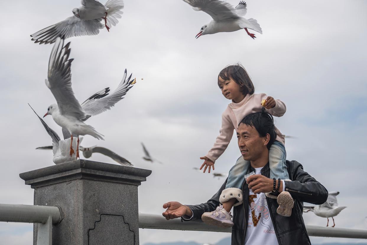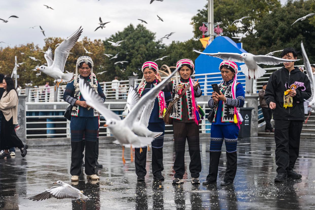 11月10日,游客在云南省昆明市海埂大坝投喂红嘴鸥。新华社记者 王冠森 摄