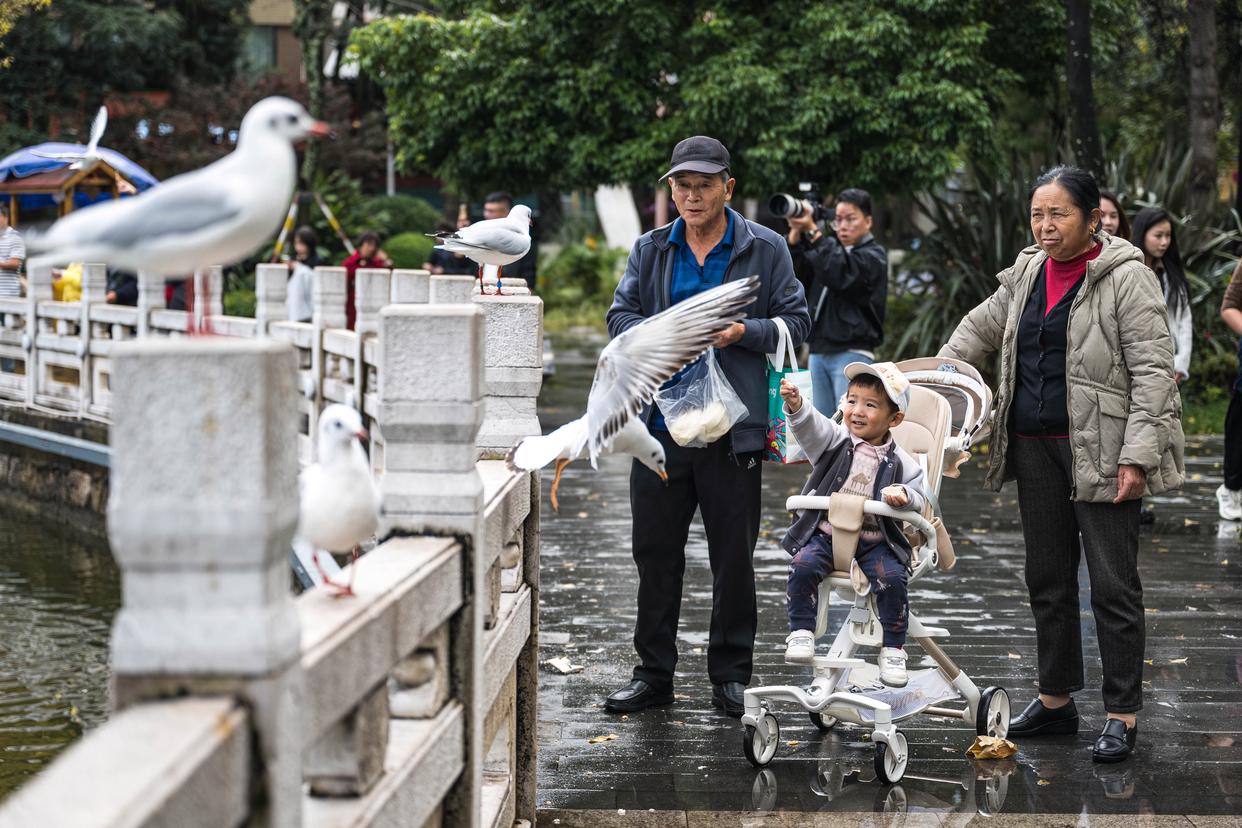 11月10日,游客在云南省昆明市翠湖公园内投喂红嘴鸥。新华社记者 王冠森 摄