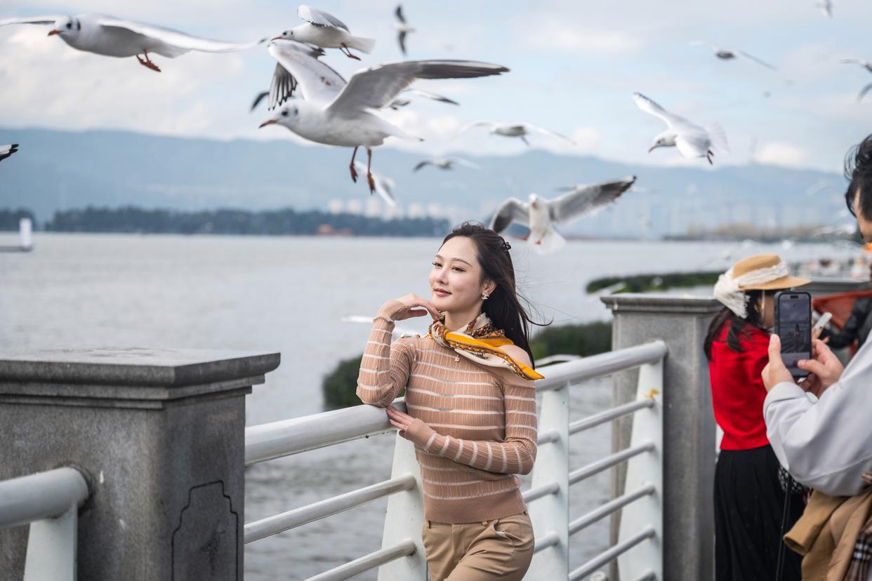 11月10日,游客在云南省昆明市海埂大坝观光留影。新华社记者 王冠森 摄