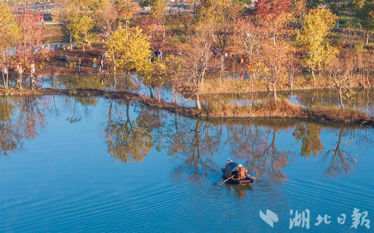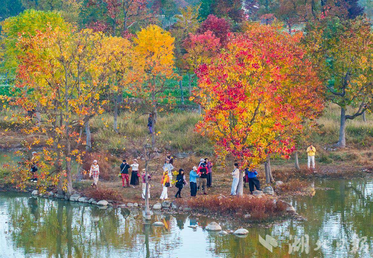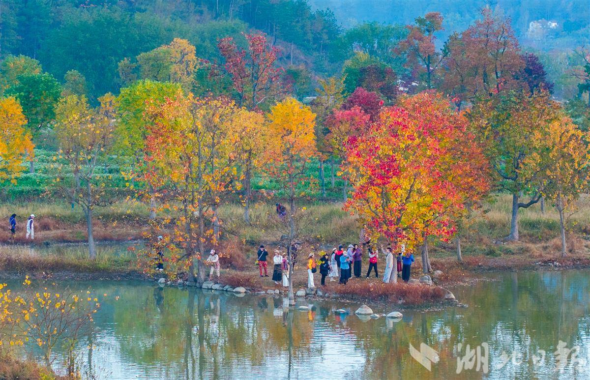 11月14日,罗田县九资河镇河西畈村,乌桕树叶缤纷绚丽,与远山碧水相互辉映,宛如一幅水墨丹青画,吸引众多游客观光游览。