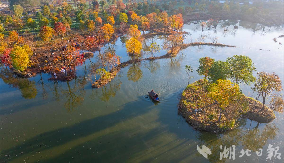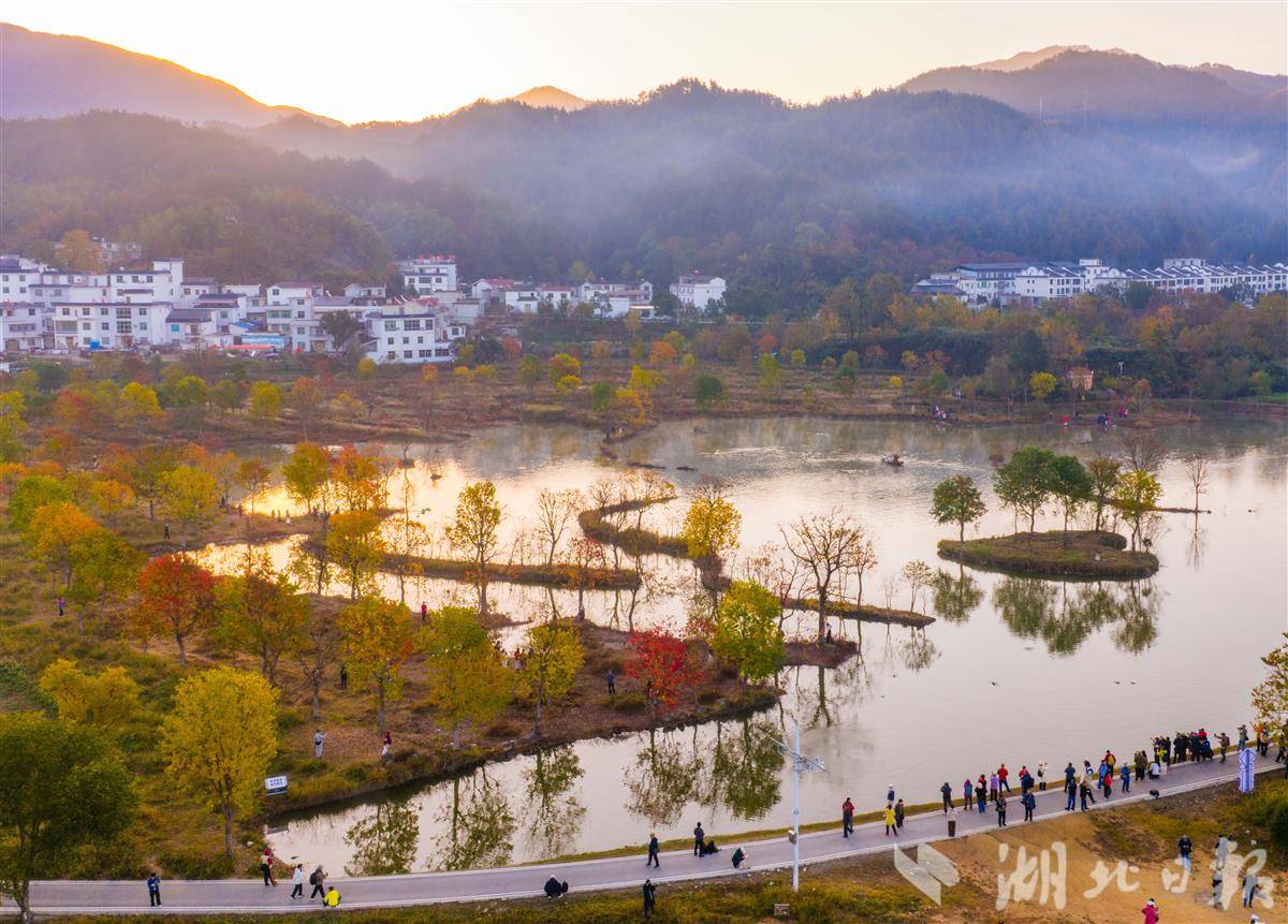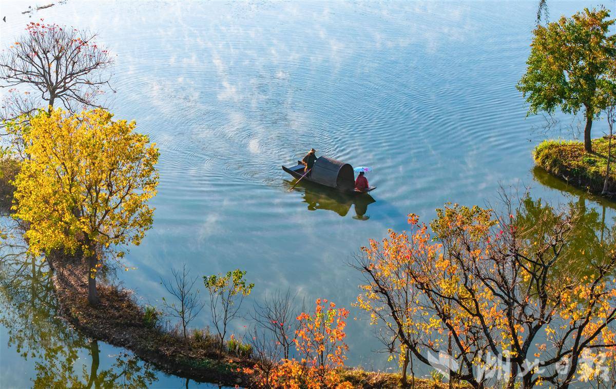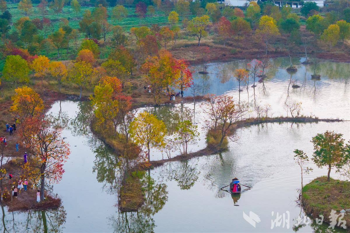 11月14日,罗田县九资河镇河西畈村,乌桕树叶缤纷绚丽,与远山碧水相互辉映,宛如一幅水墨丹青画,吸引众多游客观光游览。
