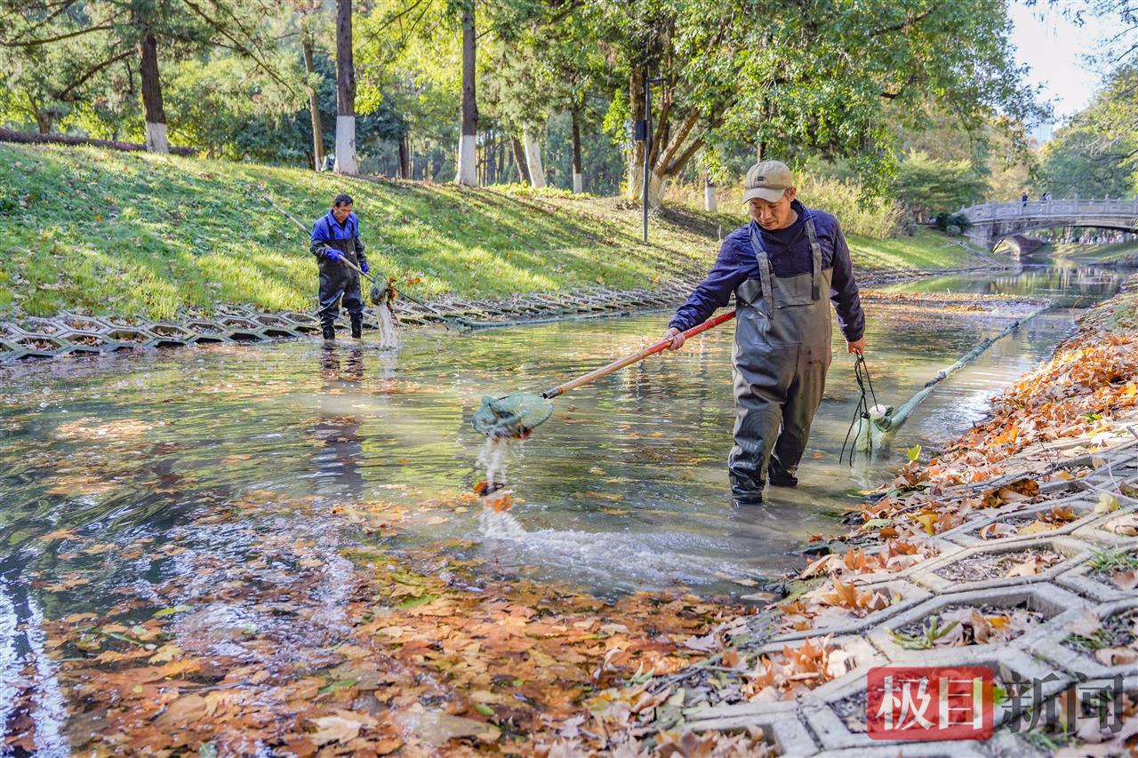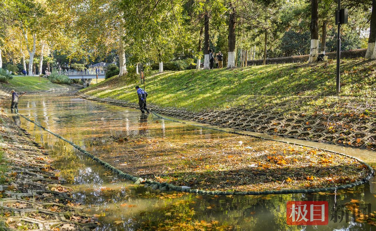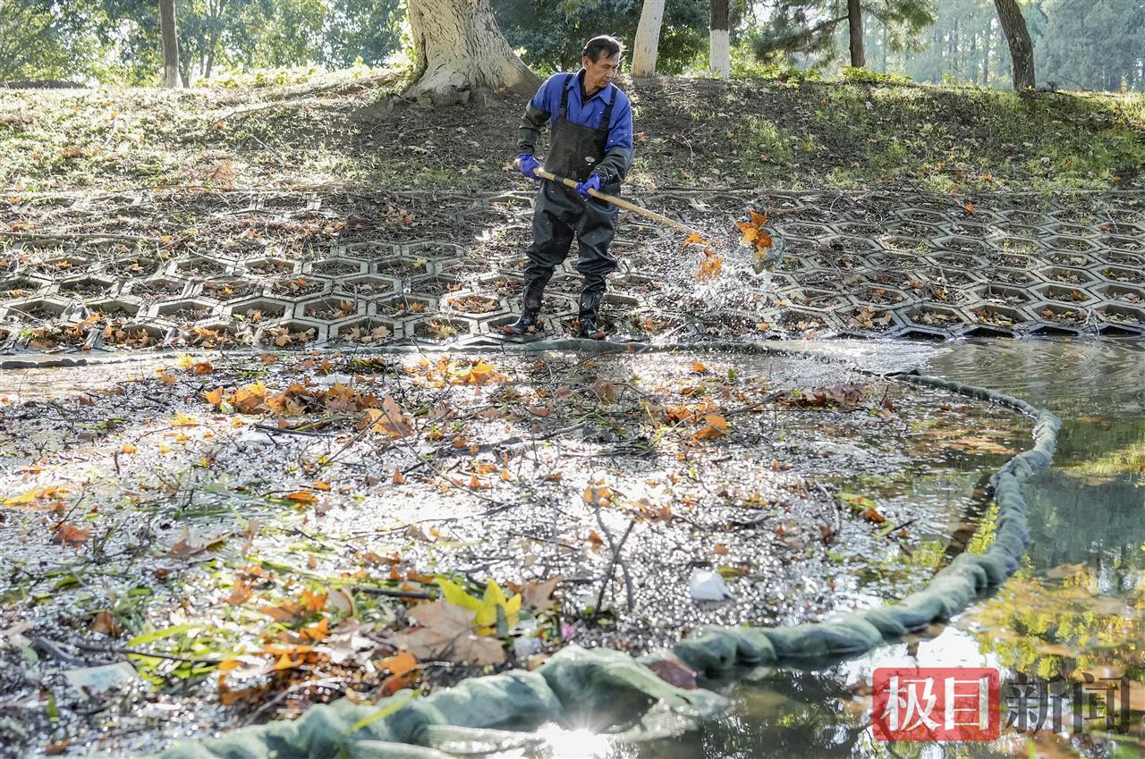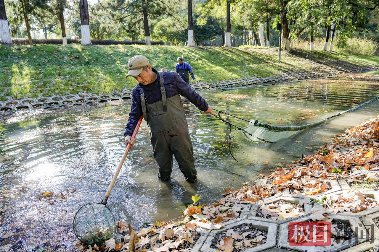 寒潮强风后,武汉街头、公园的树叶飘落满地。11月19日,一大早,武汉解放公园管理部门组织人员全力清理河道里的黄叶。在现场,两名绿化员共同协力拉着一张大网,把黄叶“捕捞”进大网、集中清走,还水面清洁。