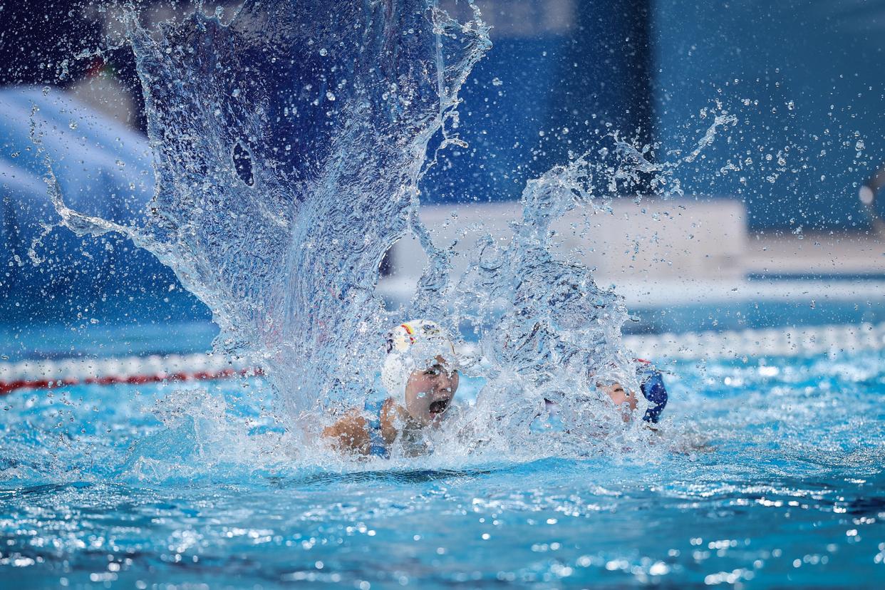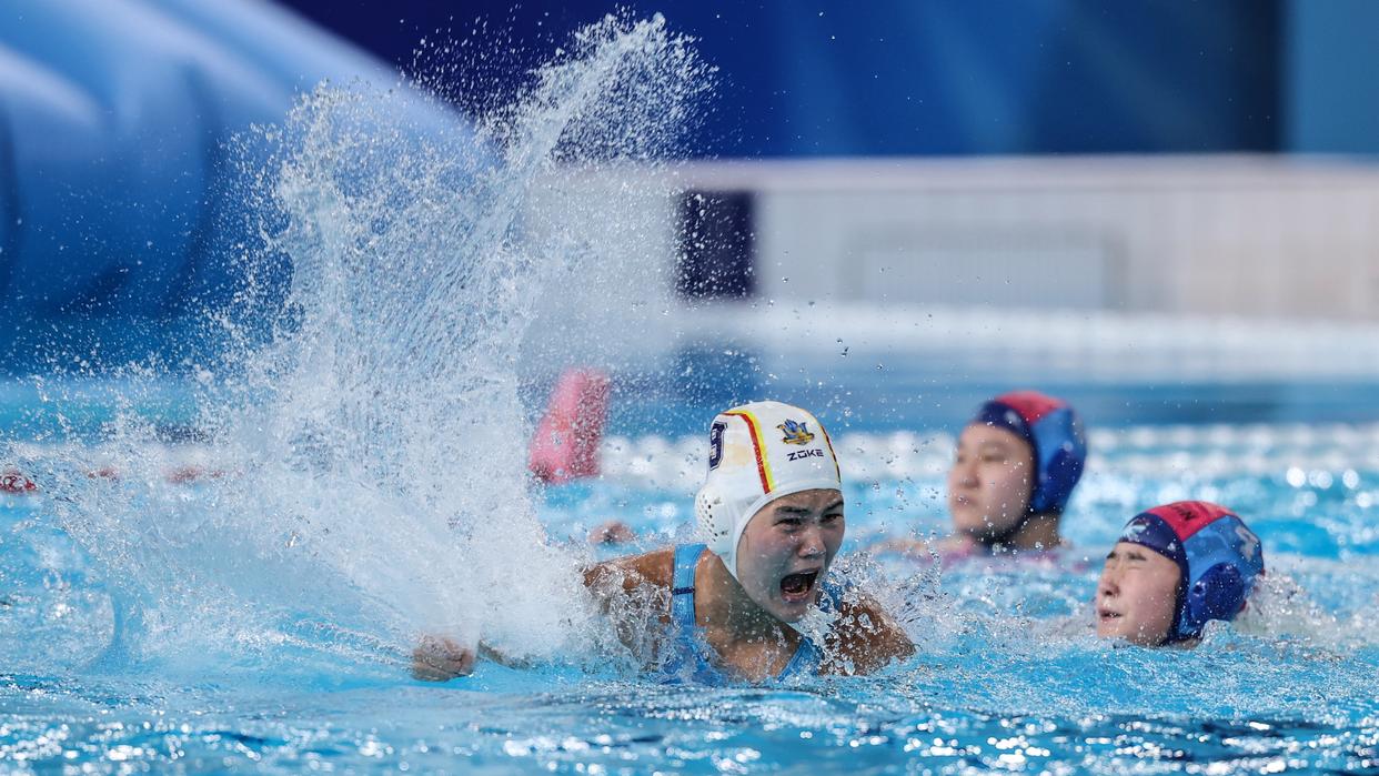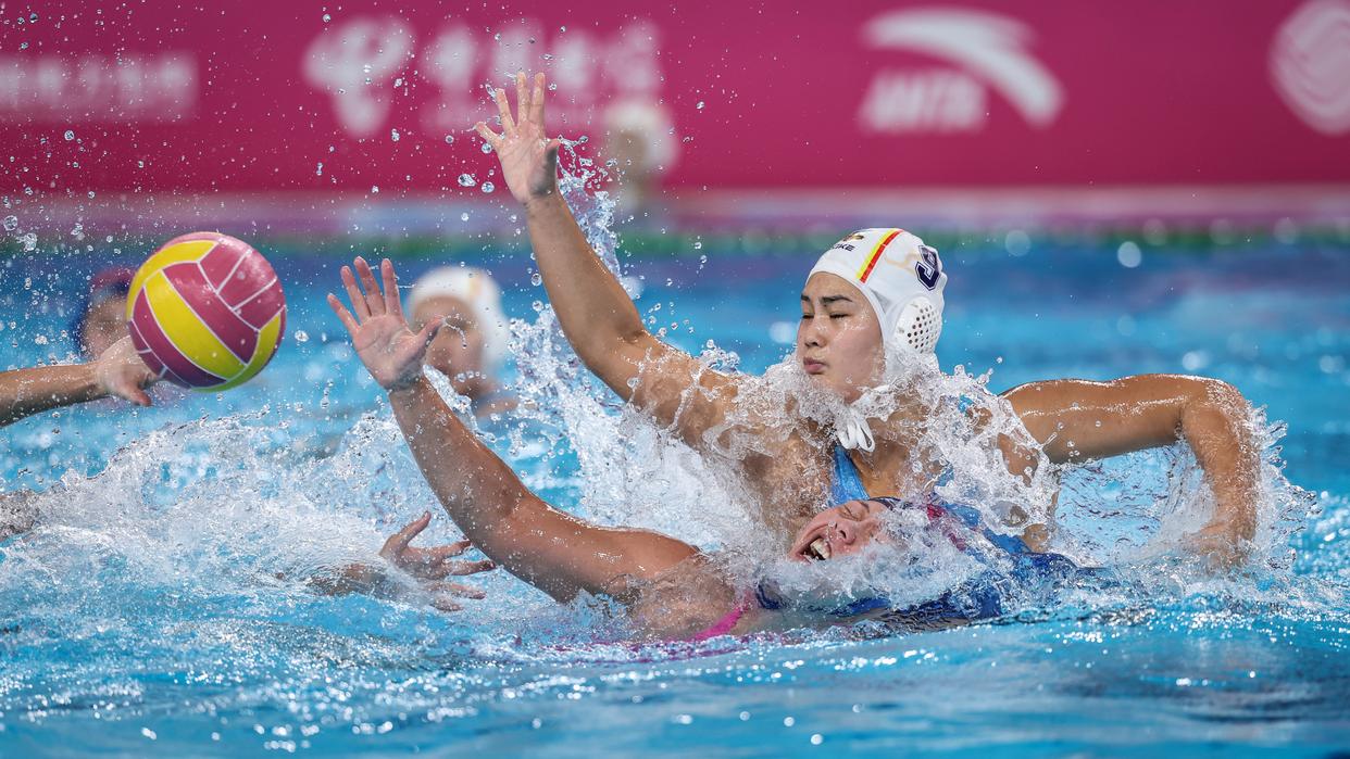 11月21日,天津队球员阎菁(下)在比赛中拼抢。 当日,第十五届全国运动会女子水球比赛在广州落幕,上海队12比6战胜天津队,夺得金牌。 新华社记者 潘昱龙 摄
