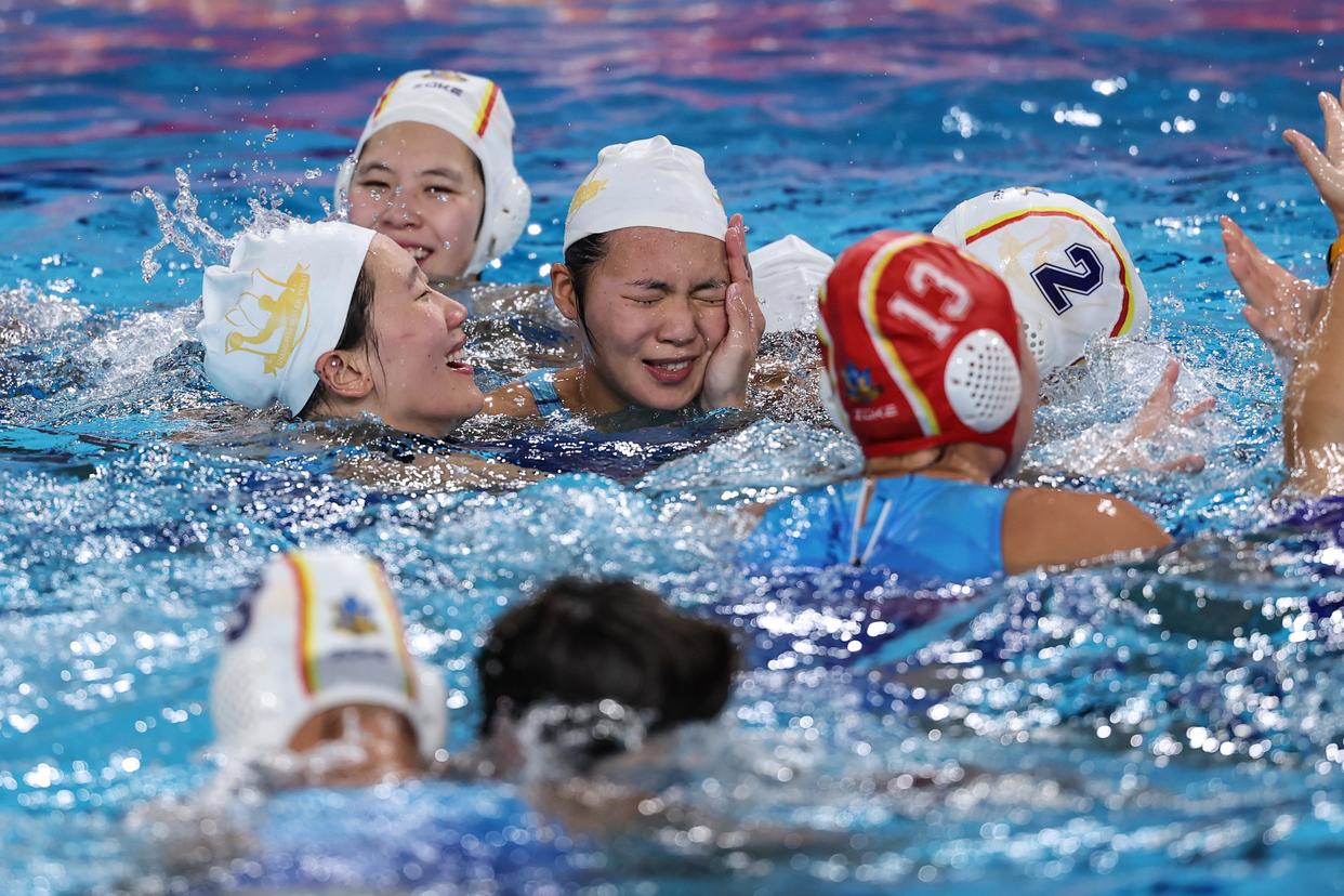11月21日,上海队庆祝夺冠。 当日,第十五届全国运动会女子水球比赛在广州落幕,上海队12比6战胜天津队,夺得金牌。 新华社记者 潘昱龙 摄
