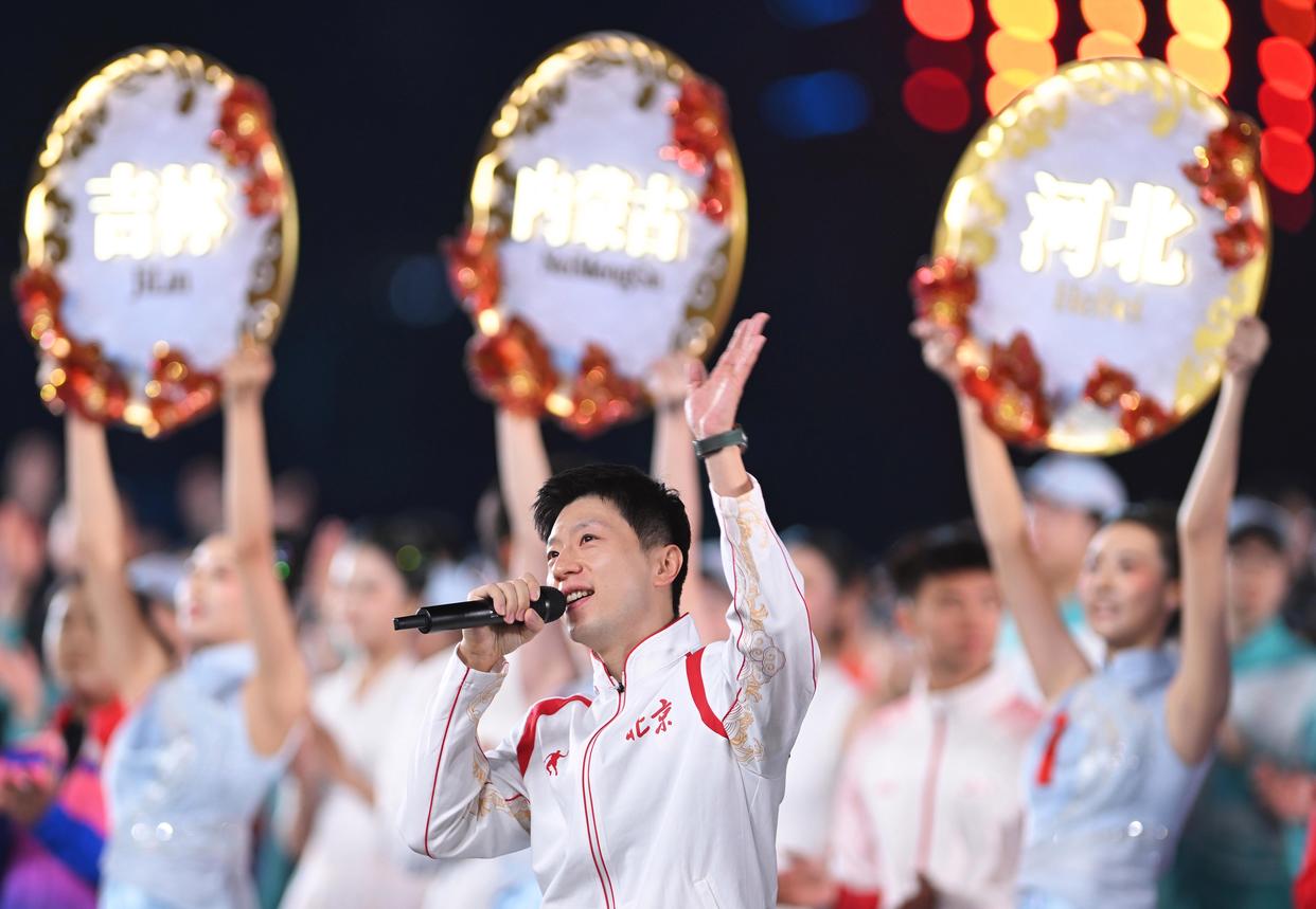 11月21日,北京队选手马龙(前)在闭幕式现场表演。 当日,第十五届全国运动会闭幕式在广东深圳前海欢乐剧场举行。 新华社记者 张龙 摄