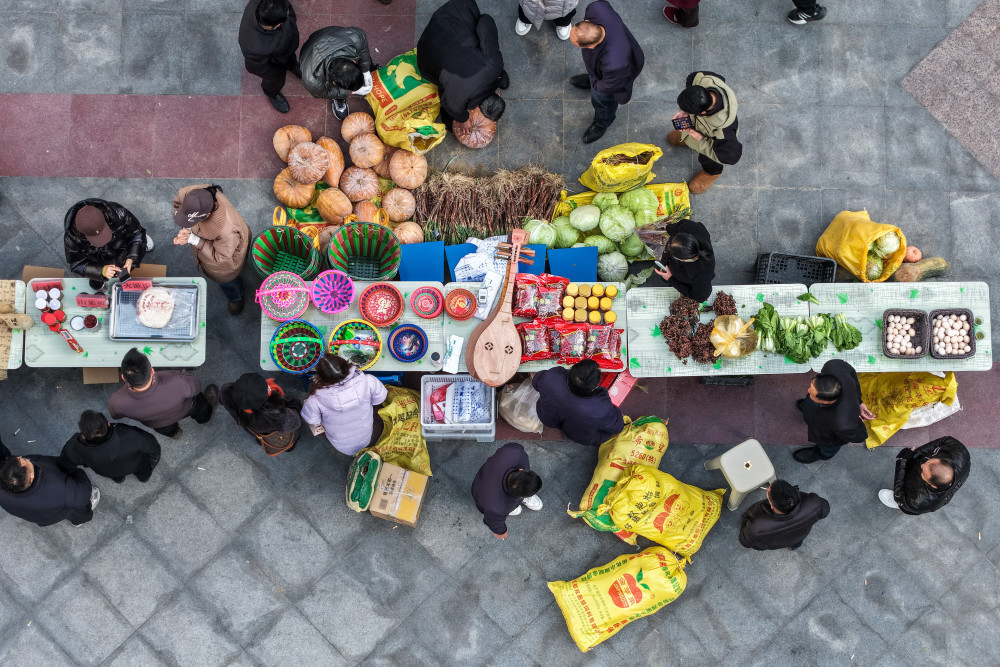 12月13日,居民在陇南市武都区“冬至大集”上选购特色农产品(无人机照片)。新华社记者 郎兵兵 摄