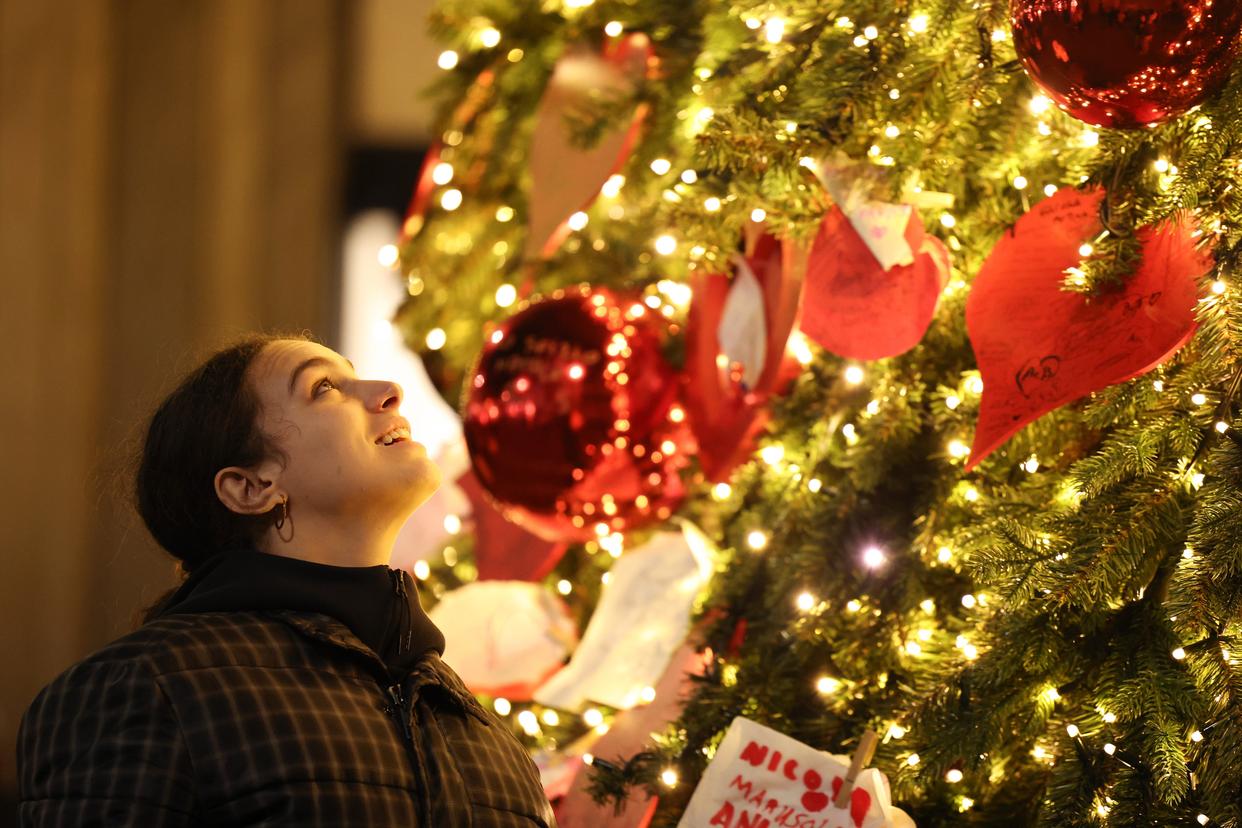 12月14日,一名女子在意大利首都罗马市中心的科尔索大道附近赏灯。新华社记者 李京 摄