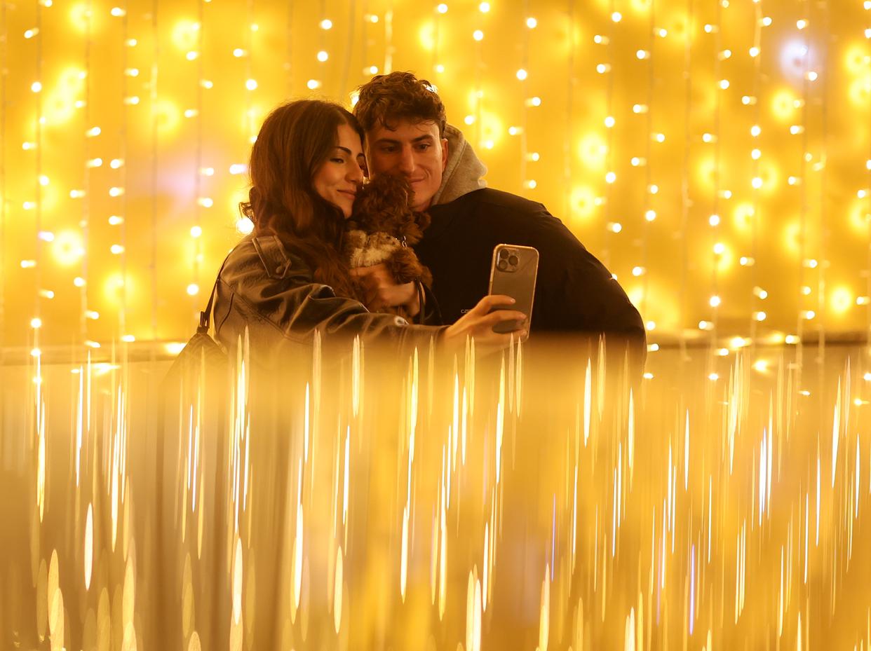12月14日,一对情侣在意大利首都罗马市中心的科尔索大道附近与彩灯合影。新华社记者 李京 摄