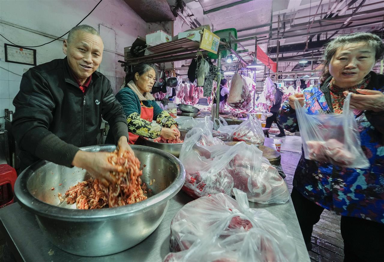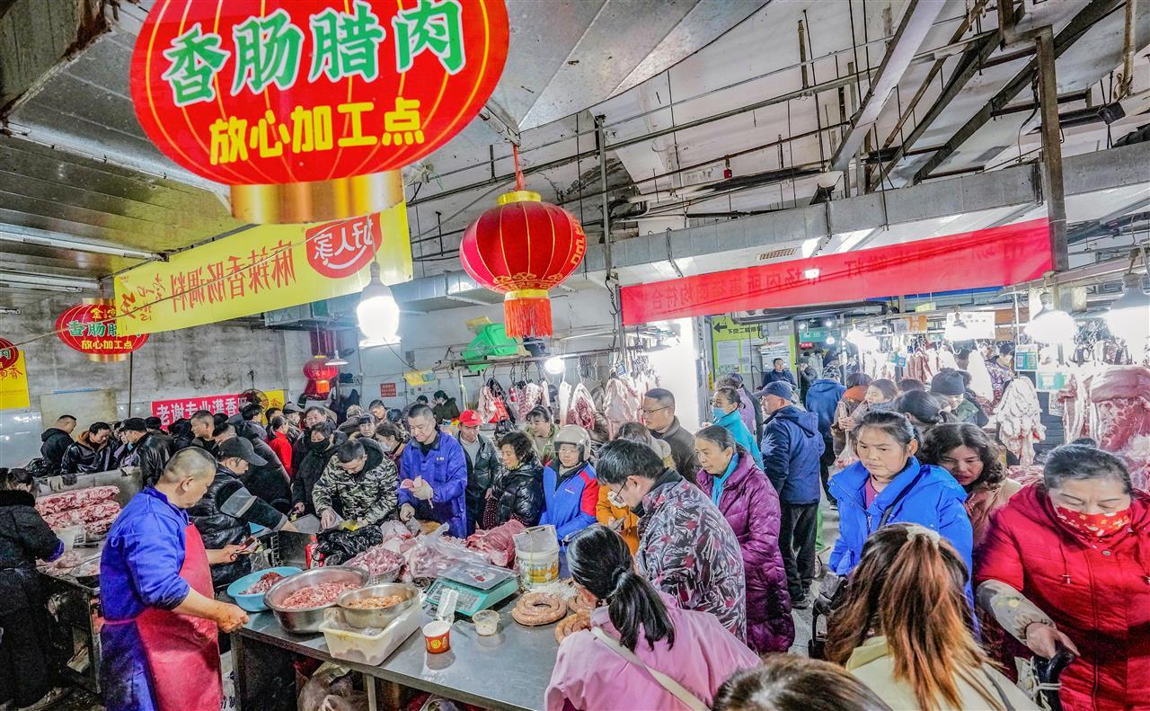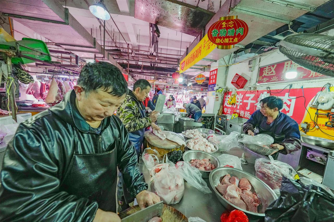 12月21日,冬至到来,武汉光谷新竹路生鲜市场香肠加工区格外热闹,几家香肠加工铺围满了顾客,店员们紧张地为顾客洗肉、剁肉、绞肉、调味、灌香肠等,散发着诱人的香气。“今年冬至,天气适合灌肠,很多顾客清晨6点就来了。”现场忙活的陈师傅自豪地说。据悉,冬月以来,武汉香肠加工市场日趋旺盛,冬至到,三镇“年味”渐浓,武汉三镇人们开始为“过年”忙碌。当日,江城市民正忙着过年的大事:灌香肠、腌鱼、腌肉。