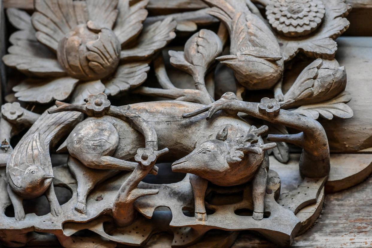 这是12月9日在山西省太原市晋祠拍摄的龙和象形的木雕。