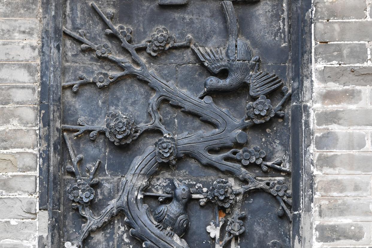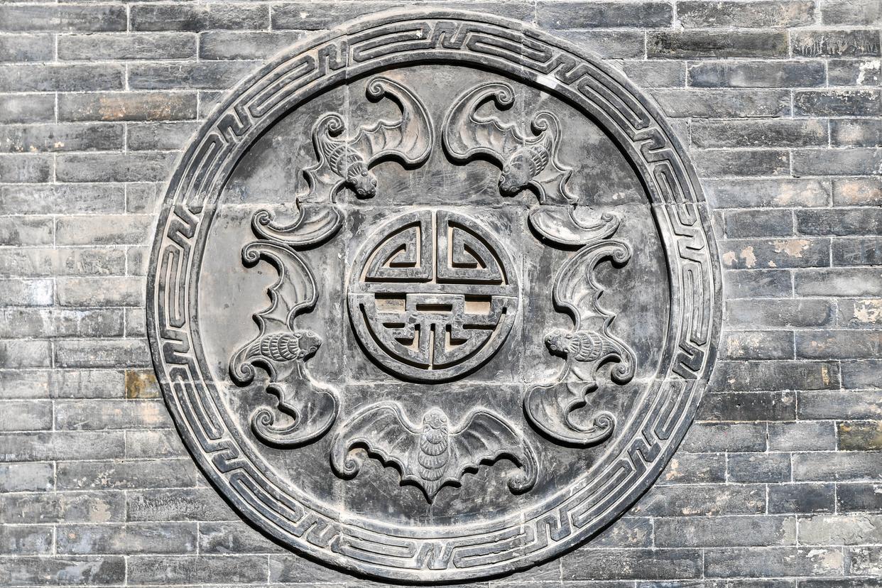 这是12月11日在山西省祁县乔家大院拍摄的蝙蝠砖雕。