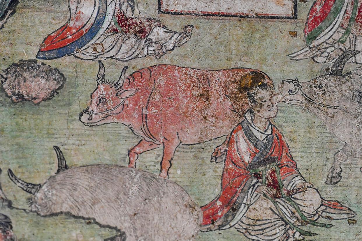 这是12月3日在山西省高平市开化寺拍摄的壁画中的牛。