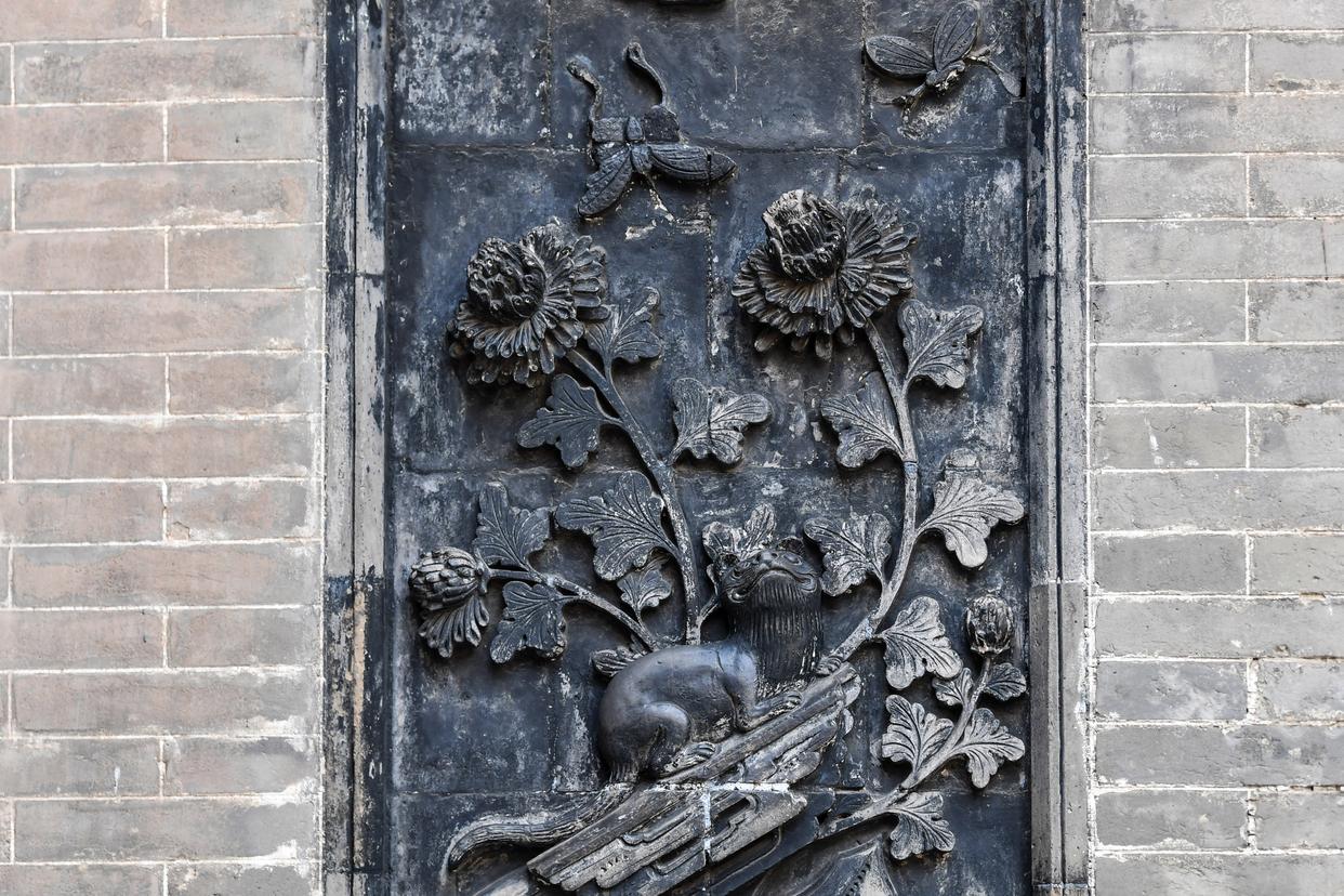 这是12月11日在山西省祁县乔家大院拍摄的猫与蝶为主题的砖雕。