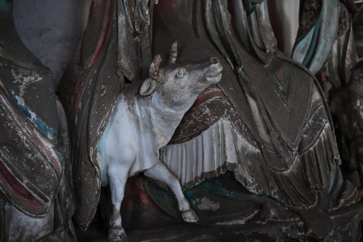 这是12月2日在山西省晋城市玉皇庙拍摄的彩塑牛。