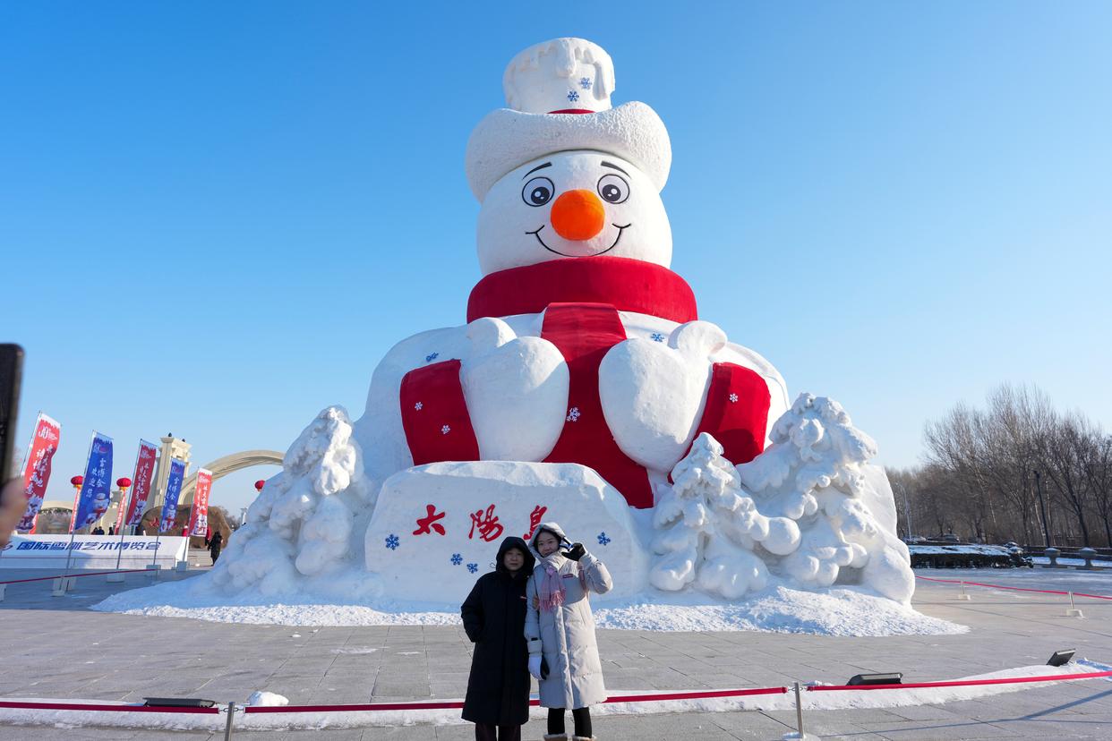 游客在第38届太阳岛国际雪雕艺术博览会园区大门前与大雪人景观合影(12月26日摄)。新华社记者 王松 摄