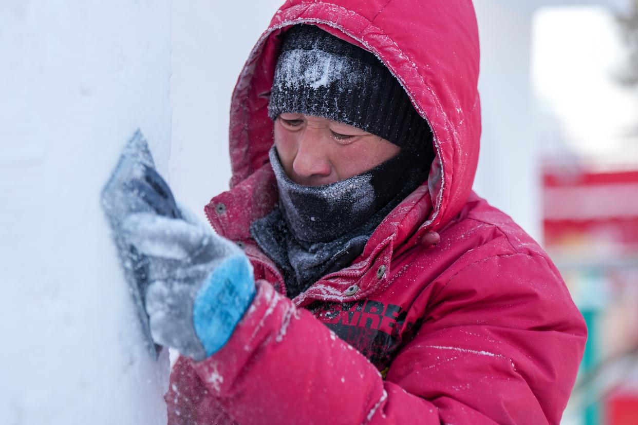 在第38届太阳岛国际雪雕艺术博览会园区,雪雕师对雪雕景观进行创作(12月26日摄)。新华社记者 王松 摄