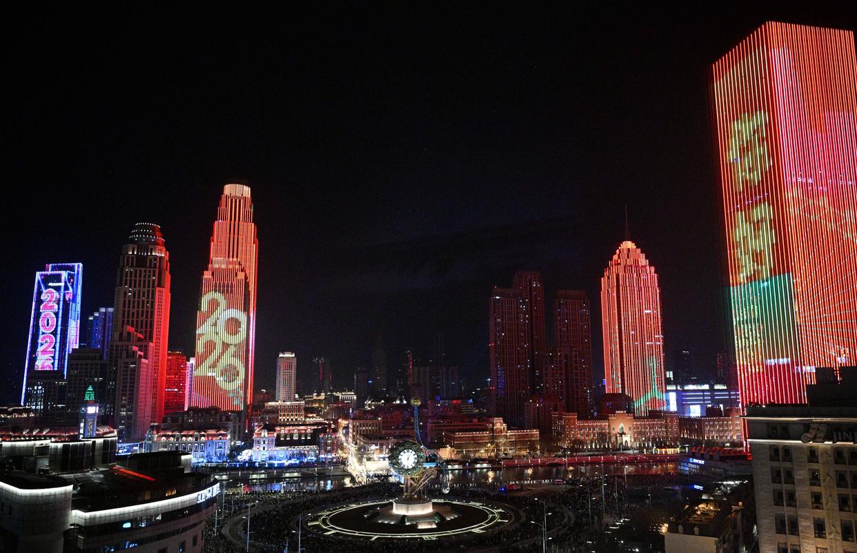 2026年1月1日凌晨拍摄的天津新年楼体灯光秀。新华社记者 孙凡越 摄
