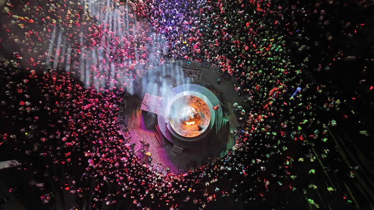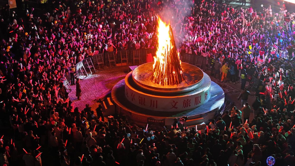 2025年12月31日晚,人们在银川文旅集团览山公园参加跨年活动(无人机照片)。新华社记者 王鹏 摄