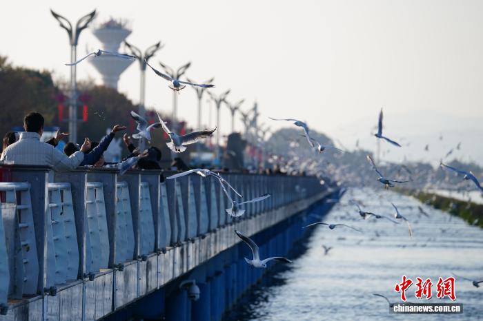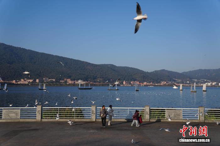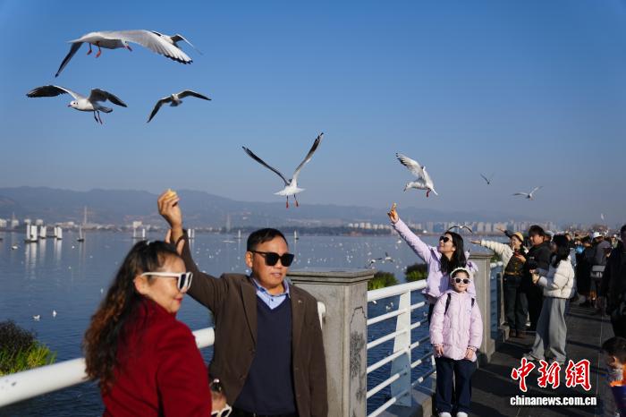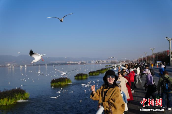 1月1日,云南昆明,市民和游客在滇池海埂大坝投喂红嘴鸥,观赏滇池风光,度过新年假期第一天。 中新社 记者 刘冉阳 摄