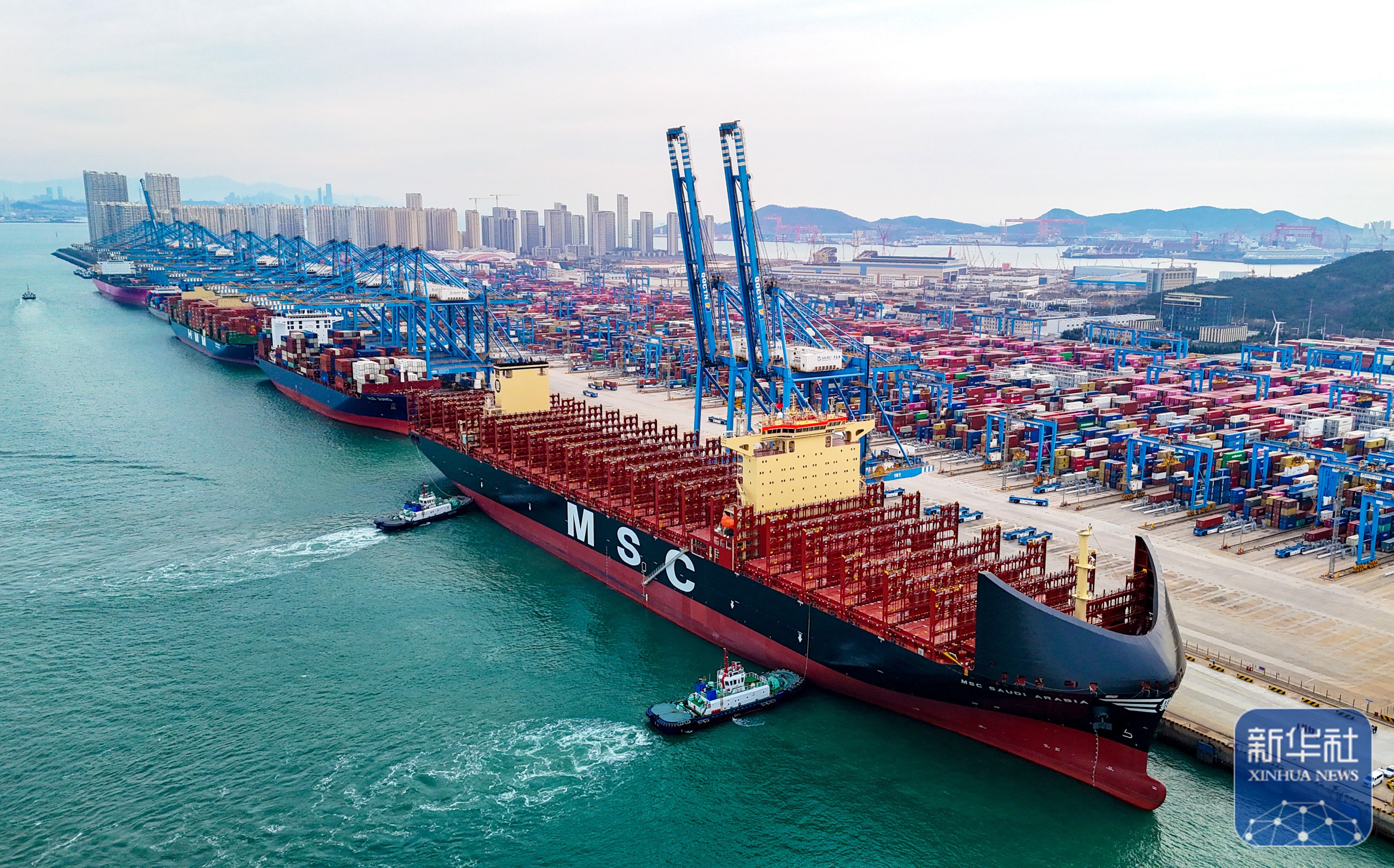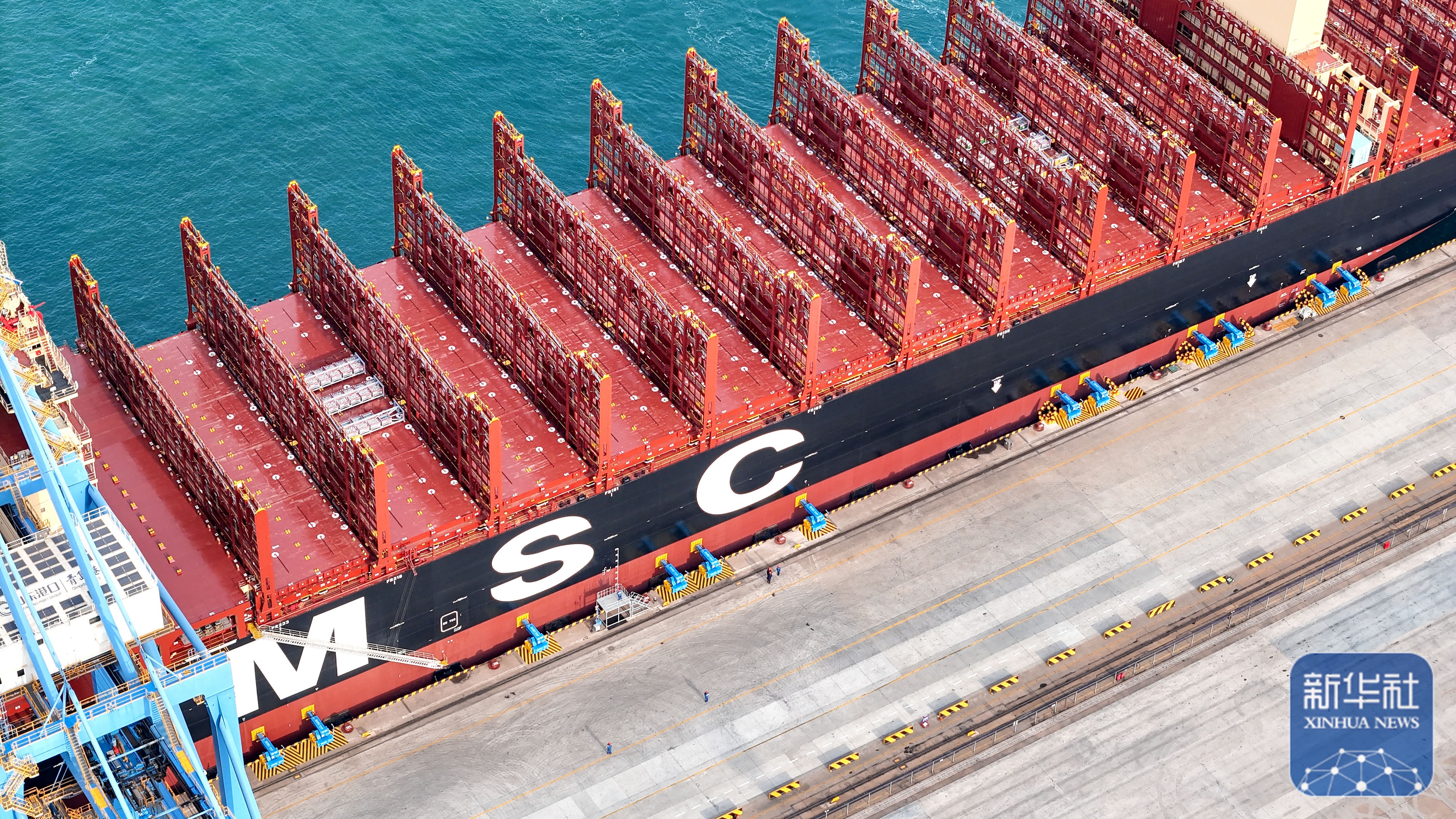 ↑ 2026年1月1日,在山东港口青岛港,“地中海沙特阿拉伯”轮通过真空式自动系泊系统停靠码头(无人机照片)。新华社发(张进刚 摄)