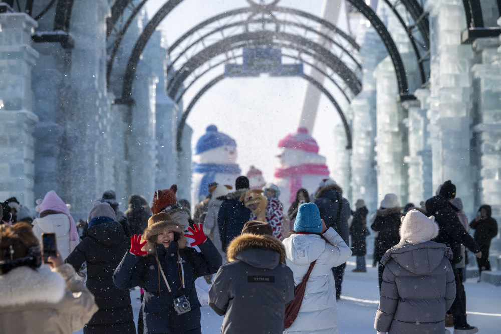 1月2日,人们在哈尔滨冰雪大世界园区拍照。新华社记者 张涛 摄