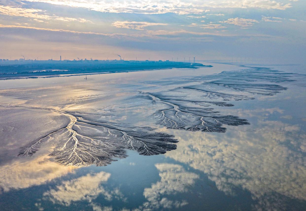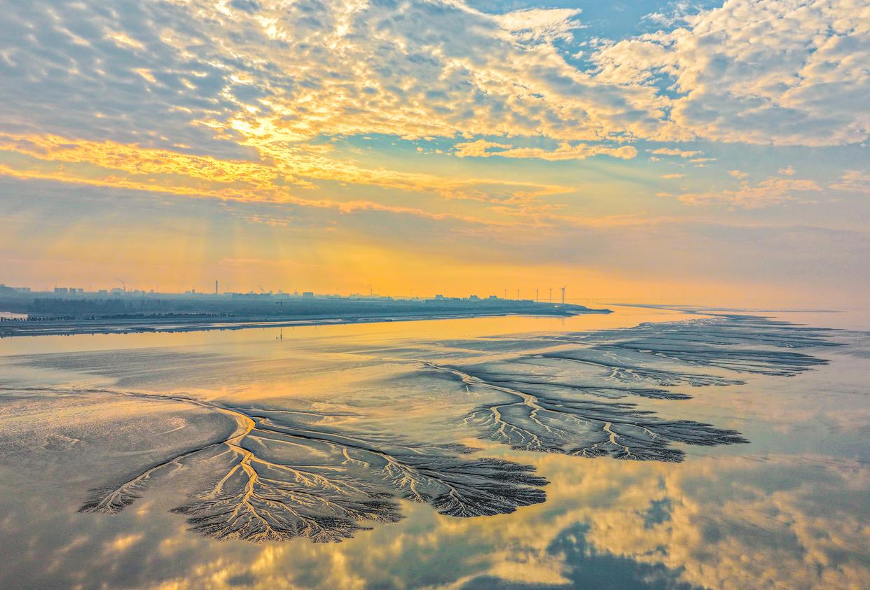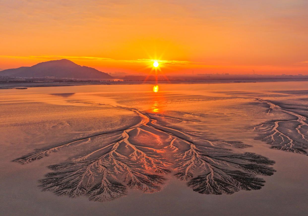 2026年1月4日,浙江嘉兴海宁钱塘江黄湾镇段现“潮汐树”景观,霞光染红江面,云影浮动,构成一幅壮美的自然画卷。