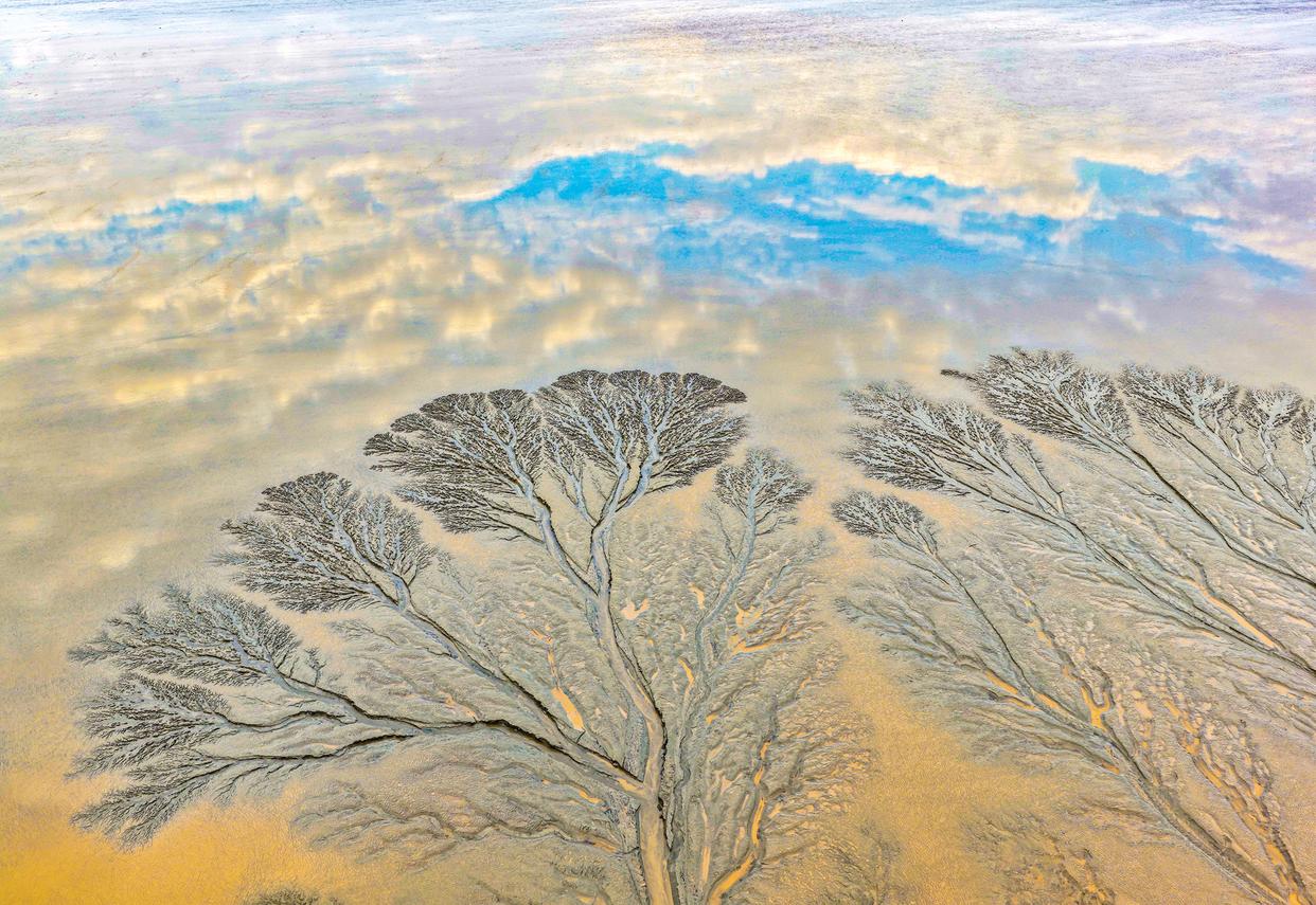 ↑2026年1月4日在浙江嘉兴海宁钱塘江黄湾镇段拍摄的“潮汐树”景观。(无人机照片)CICPHOTO/张连华 摄