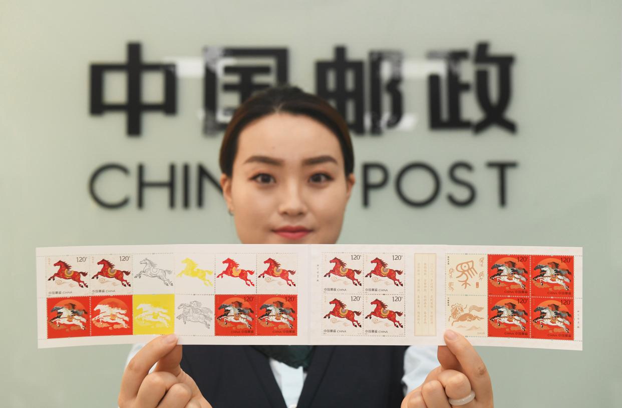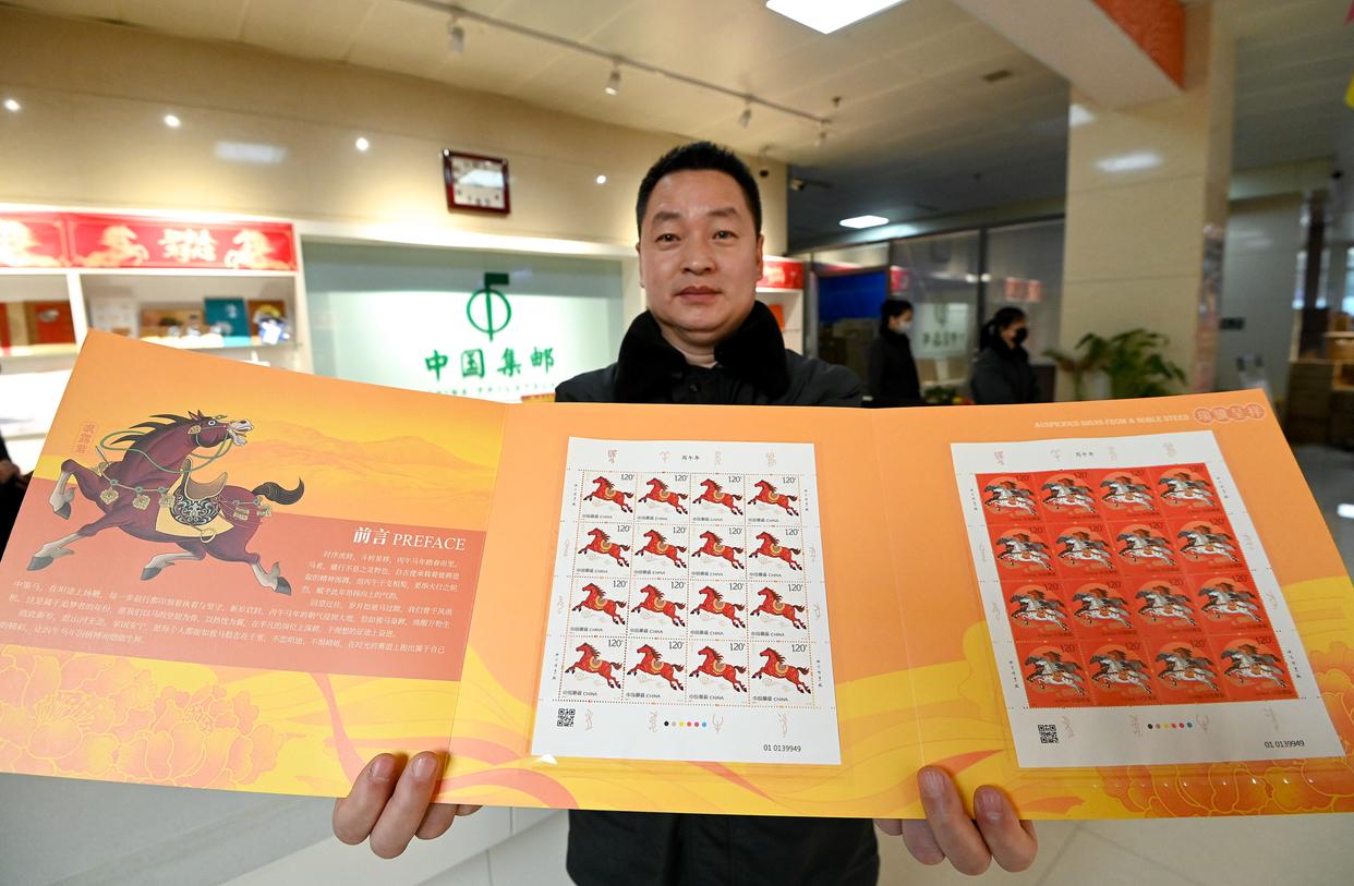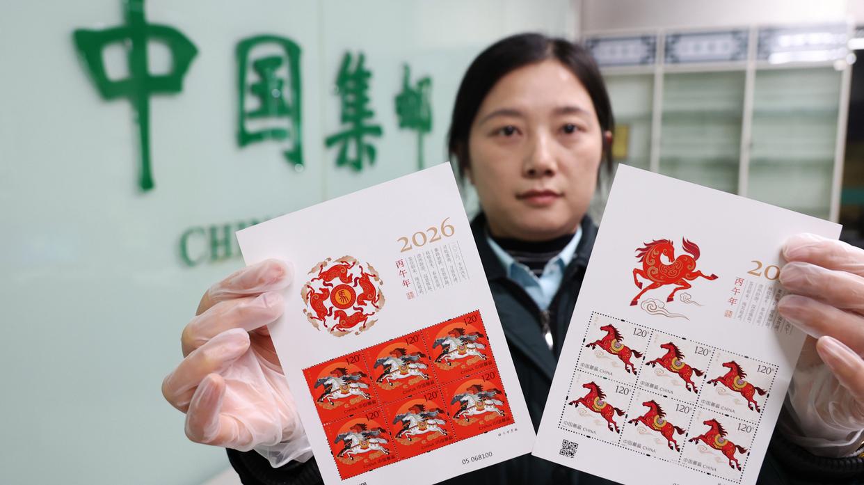 ↑2026年1月5日,中国邮政集团有限公司河北省新乐市分公司工作人员在展示发行的《丙午年》特种邮票。CICPHOTO/贾敏杰 摄