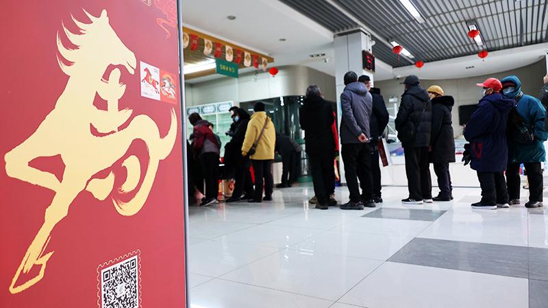 ↑2026年1月5日,中国邮政集团有限公司江苏省连云港市分公司苍梧路集邮旗舰店,集邮爱好者在排队购买《丙午年》特种邮票。CICPHOTO/耿玉和 摄