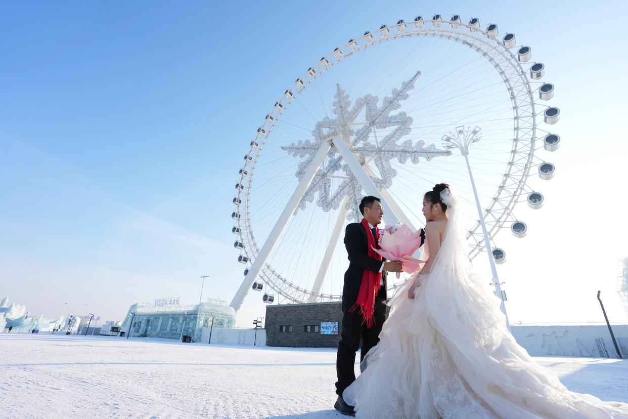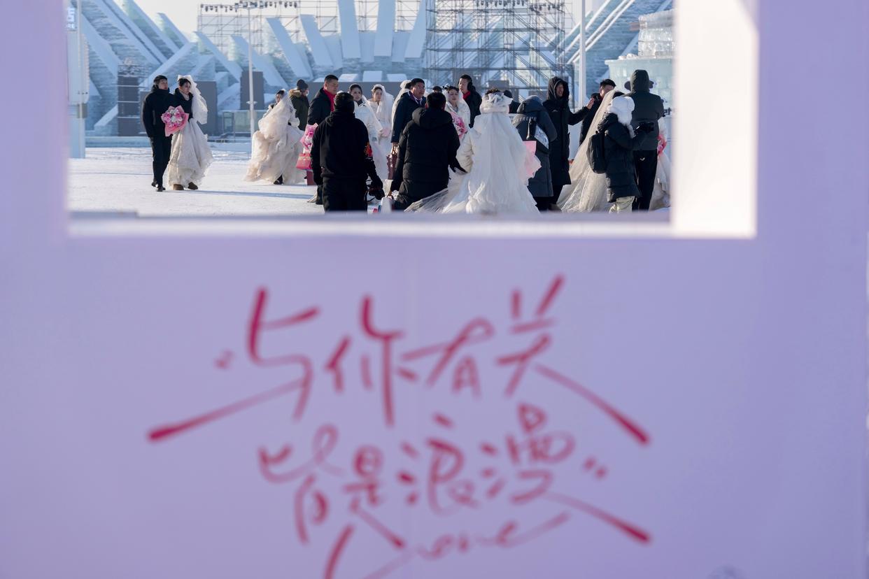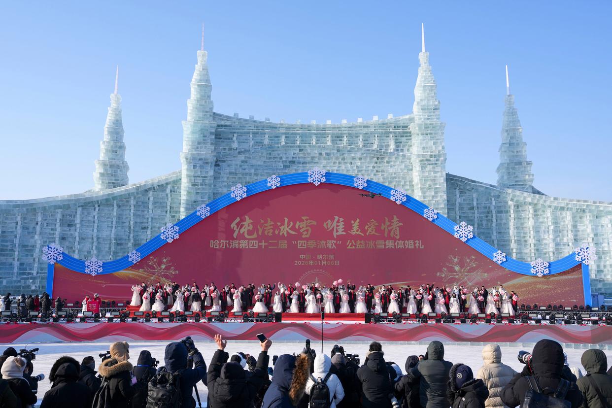 这是1月6日在哈尔滨冰雪大世界园区拍摄的哈尔滨第四十二届“四季沐歌”公益冰雪集体婚礼现场。新华社记者 王松 摄