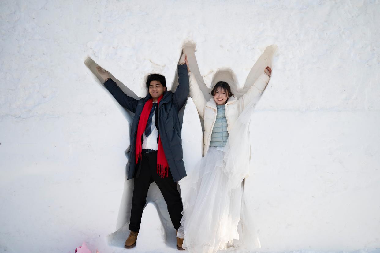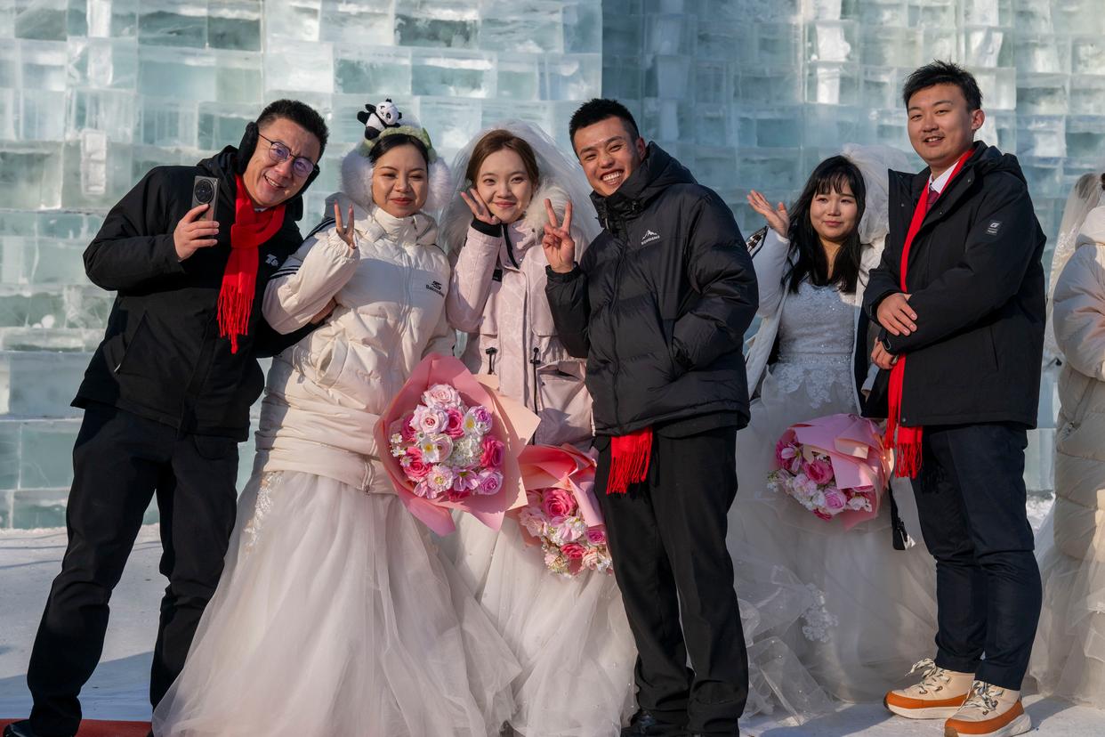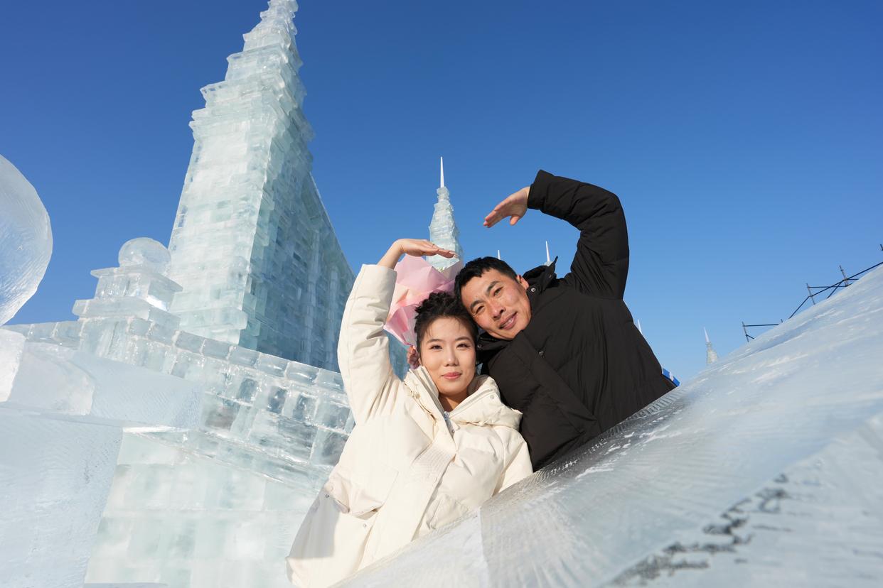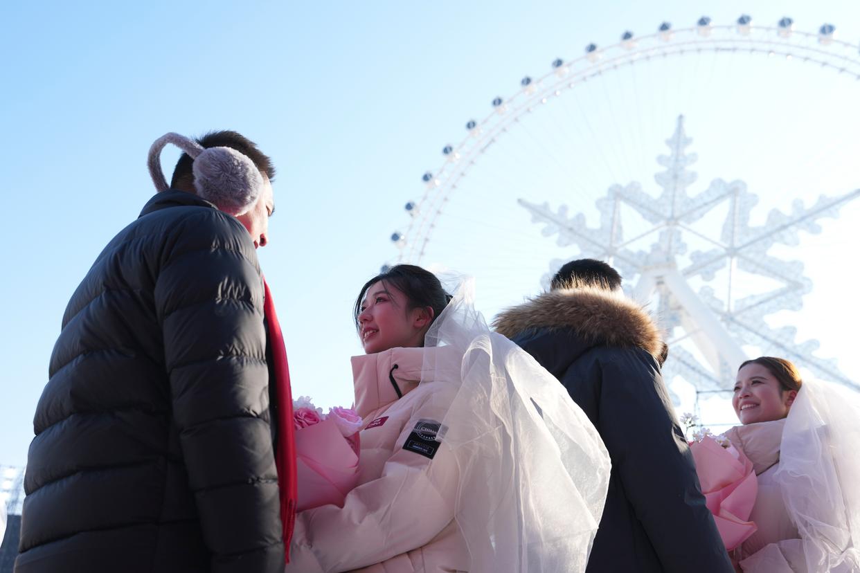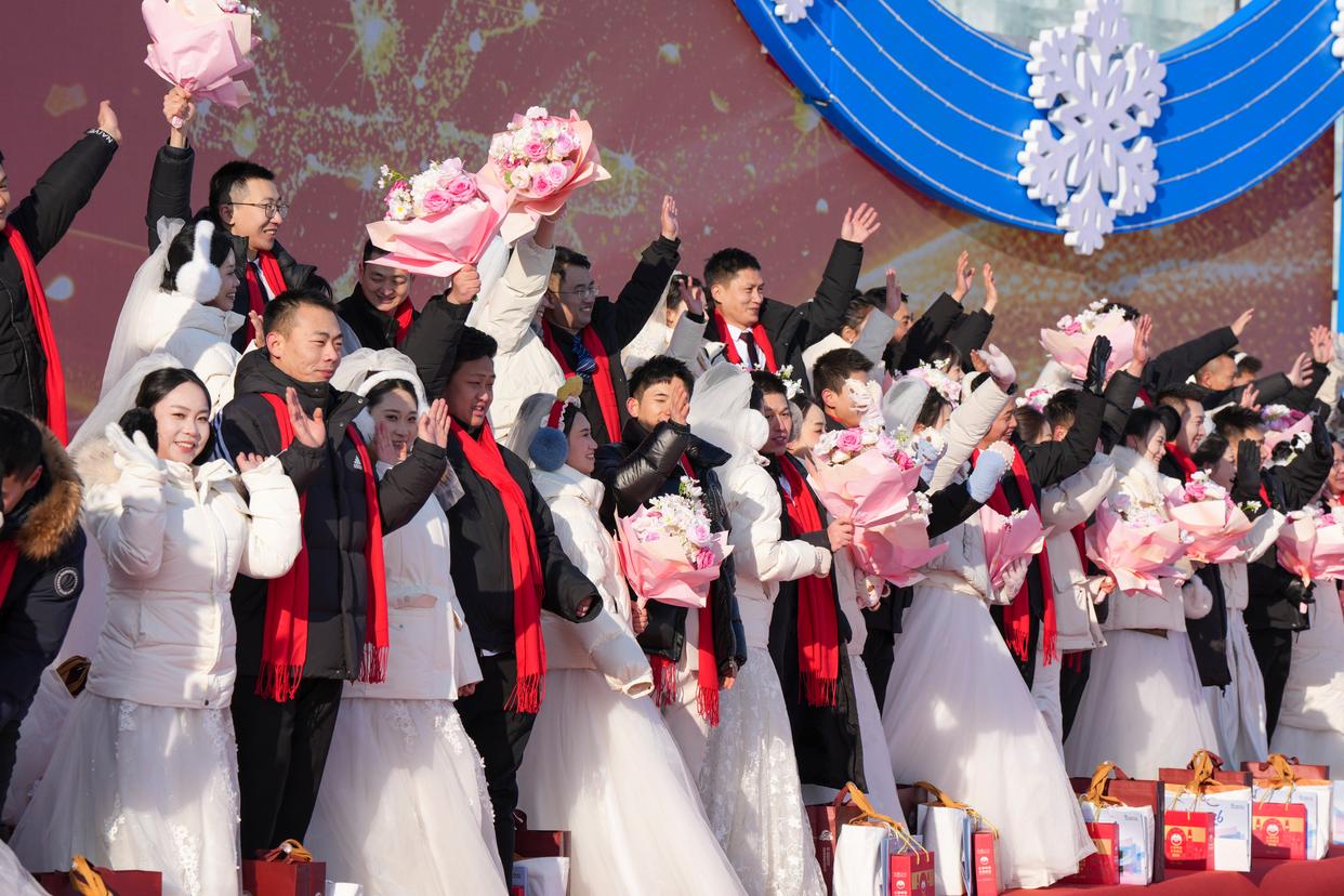 1月6日,在哈尔滨冰雪大世界园区,新人参加公益冰雪集体婚礼。新华社记者 张涛 摄