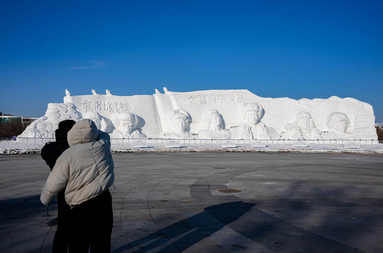 1月5日,游客在长春世界雕塑园观赏抗联主题雪雕。新华社记者 颜麟蕴 摄