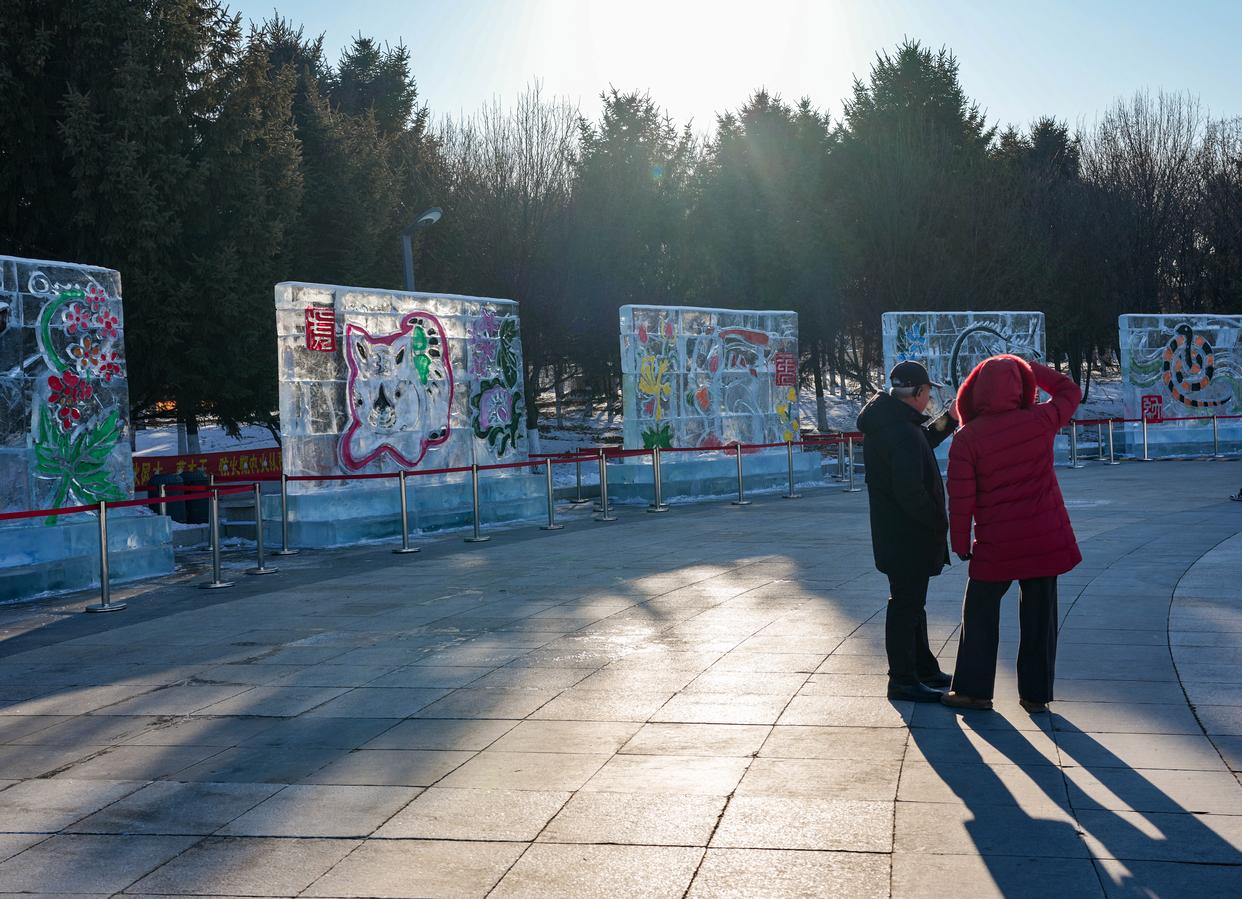 1月5日,游客在长春世界雕塑园观赏特色冰雕画。新华社记者 颜麟蕴 摄
