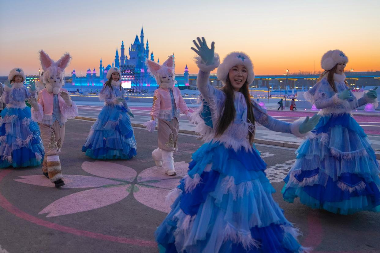 1月5日,演职人员在长春市肆季南河岸线公园进行冰雪主题巡游。新华社记者 许畅 摄